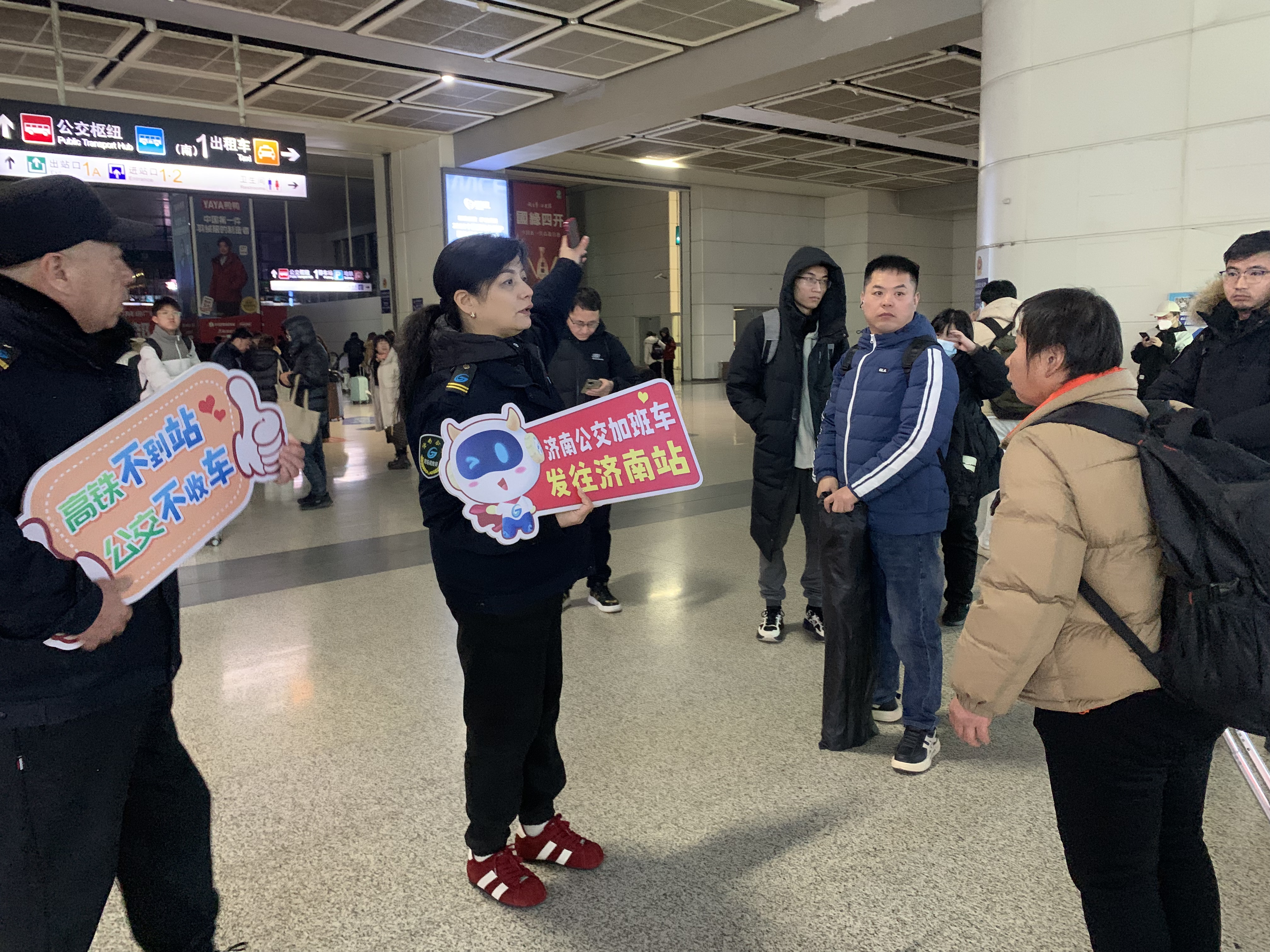凌晨的寒风中,公交驾驶员林付亮、崔倩倩率先手持醒目的引导指示牌,前往济南西站出站口主动对接旅客。他们穿梭在人流中,清晰指引旅客前往公交枢纽的换乘路线,耐心解答关于线路走向、末班车时间等各类问询。与此同时,站台内的辛明远、郑慧也同步投入服务,一边引导乘客按序排队乘车、维护现场秩序,一边主动帮扶携带大件行李的旅客搬运行李,用细致服务化解旅客深夜出行的不便。