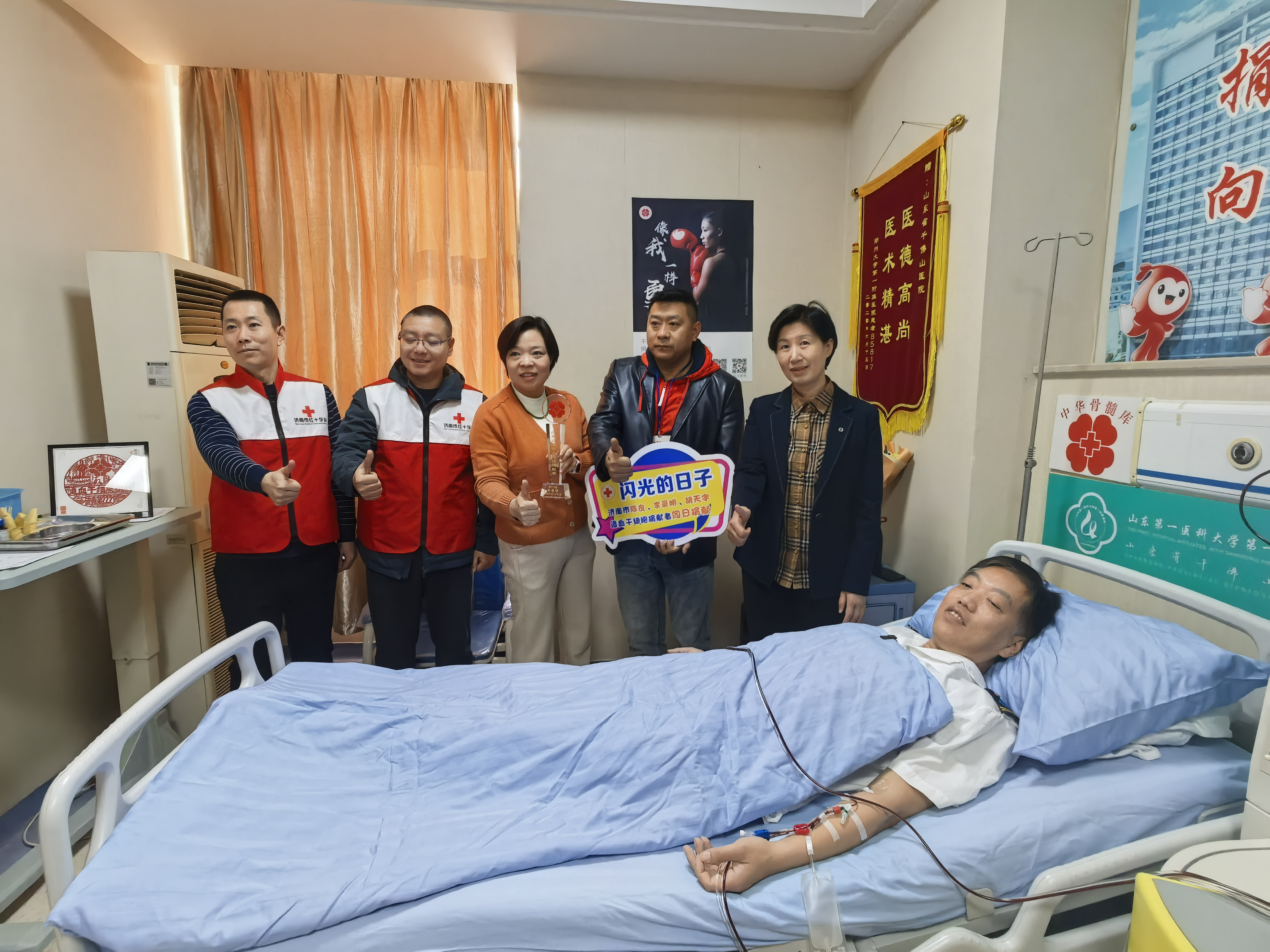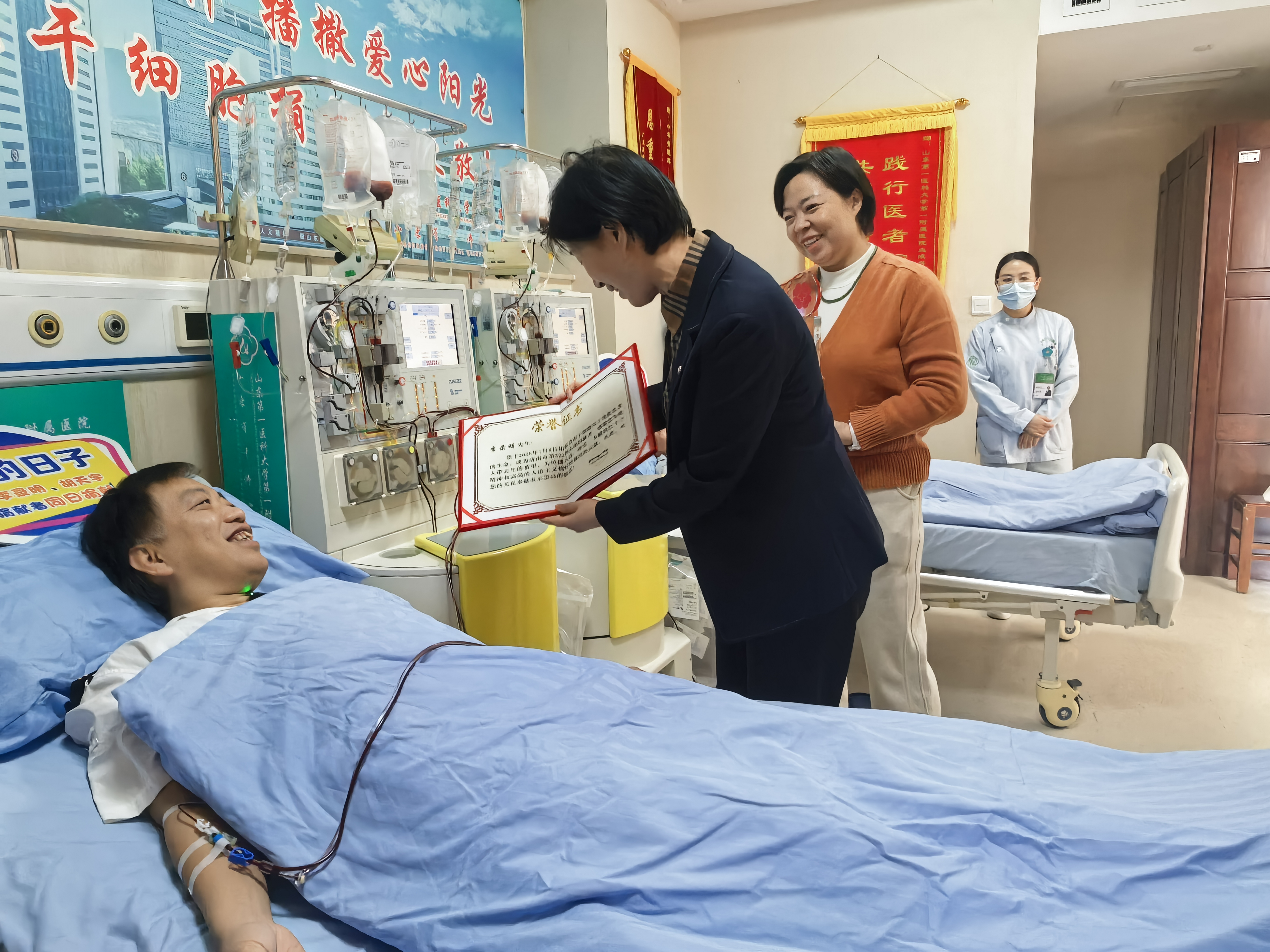 济南市红十字会、历下区红十字会和济南公交集团相关领导到医院探望并为其颁发《造血干细胞捐献荣誉证书》、纪念奖杯和“公交榜样温暖泉城——董事长特别奖”。