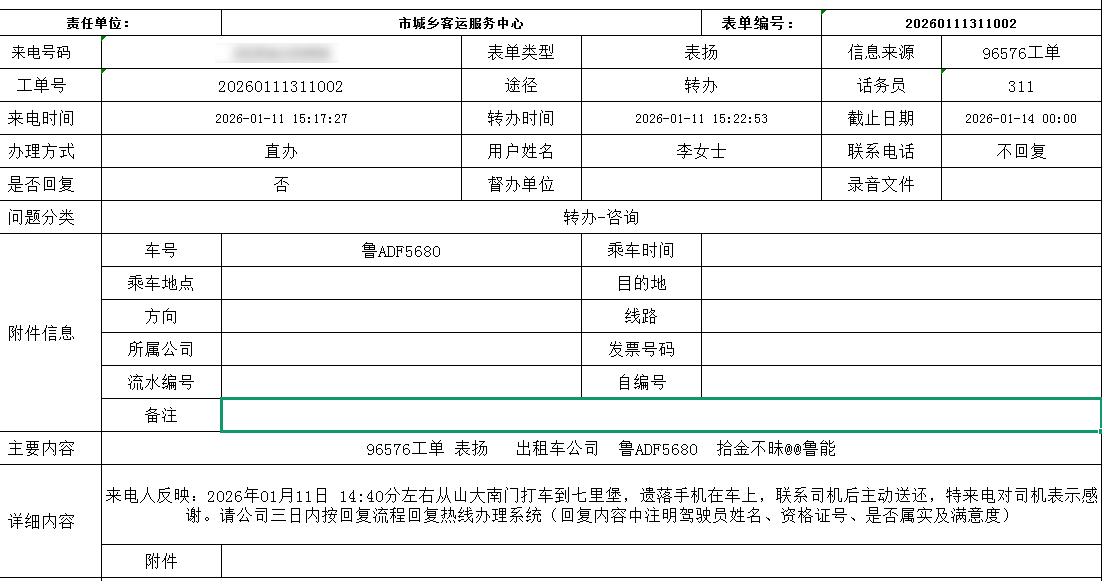 济南公交官网讯 1月11日下午14点40分左右,济南恒通出租汽车公司鲁ADF5680号驾驶员陈克玲师傅,像往常一样驾驶车辆在营运线路上忙碌。