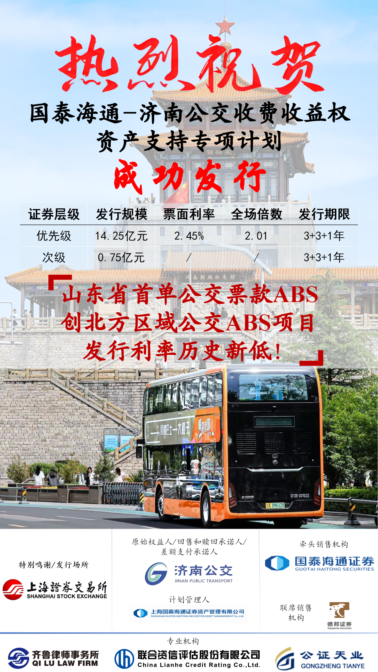 济南公交官网讯 1月23日,济南公共交通集团发起的国泰海通-济南公交收费收益权资产支持专项计划成功发行,以优质资产表现斩获资本市场高度青睐。本次专项计划发行规模达15亿元,优先级票面利率2.45%,全场认购倍数高达2.01倍,充分彰显了投资者对济南公交资产质量、现金流稳定性及发展潜力的坚定信心。
