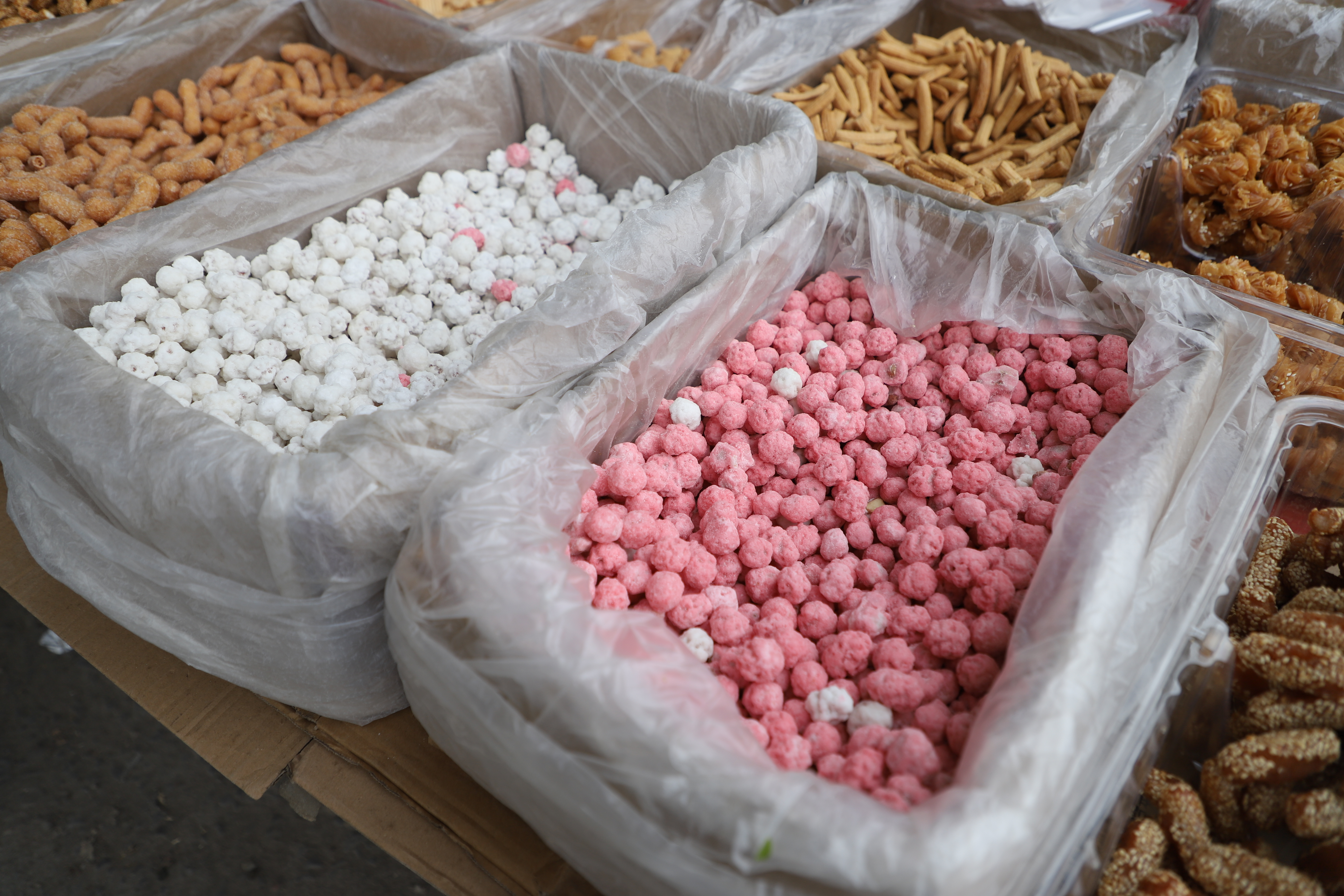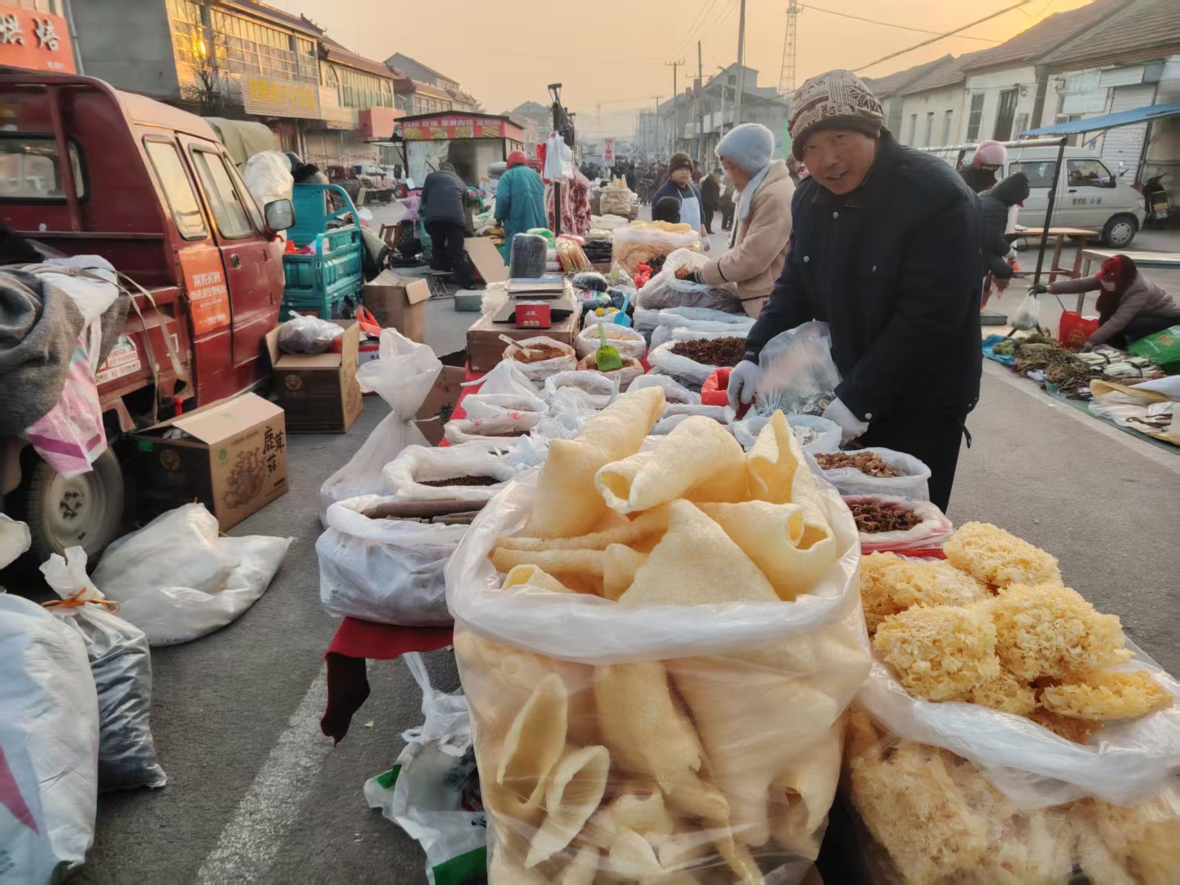 集市里,不时传来爆米花炉子的响声和商贩们热情的叫卖声,交织成一首充满生活气息的交响曲。顺着响声望去,集市入口处人头攒动,鲜红的春联、喜庆的福字、寓意吉祥的中国结挂满了摊位,五颜六色的糖果、干货堆成了小山,摊主们一边麻利地给顾客称货打包,一边用带着莱芜口音的吆喝声招揽生意,处处洋溢着浓浓的年味儿。