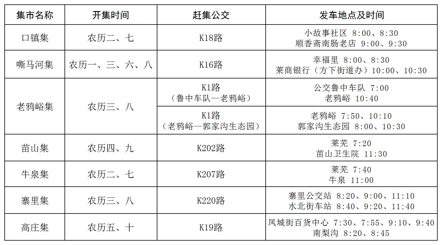 温馨提示:“赶集公交”于2月15日(腊月二十八)前,在口镇集、嘶马河集、苗山集、老鸦峪集、牛泉集、寨里集、高庄集开集时运营。与此同时,途经集市的常规公交也会增加班次,为大家的出行提供便利。如您在乘公交方面有什么疑问,欢迎拨打莱芜公交客服热线0531-76112367进行咨询。