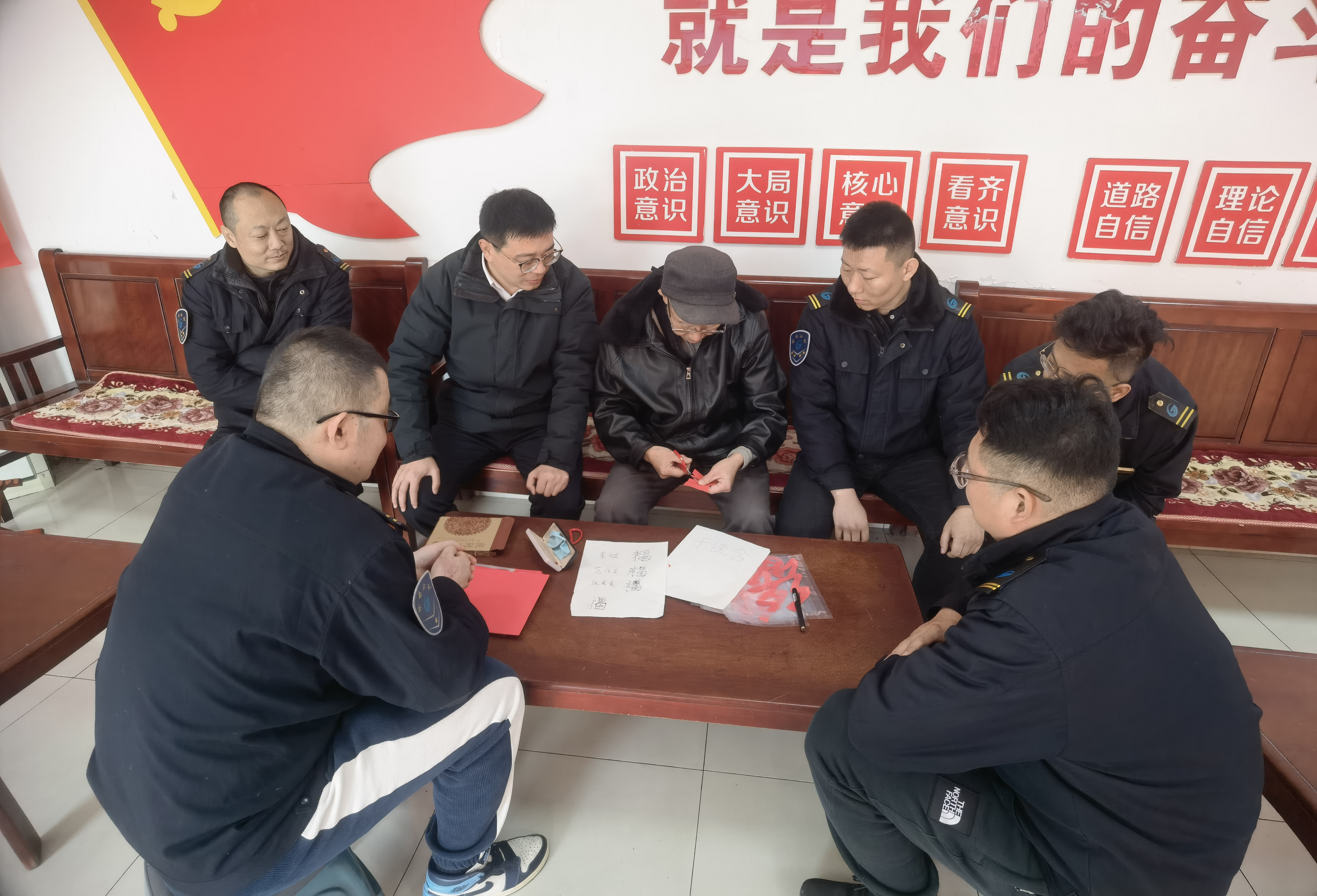 活动现场,徐大爷展纸执剪,游刃有余。他将车队每一位驾驶员的名字巧妙融入传统“福”字造型,精心剪制出独一无二的“姓名福”作品。一笔一画寄深情,一纸一剪蕴匠心,当驾驶员们接过印有自己名字的“福”字时,脸上洋溢出惊喜与感动。这份特殊的礼物,不仅承载着浓浓的年味,更传递着车队对一线职工的深情厚谊。与此同时,徐大爷还将自己亲手制作的多面马年剪纸红旗悬挂于站房内进行展览,红旗迎风微动,骏马剪纸栩栩如生,为忙碌的公交场站增添了喜庆祥和的节日氛围。