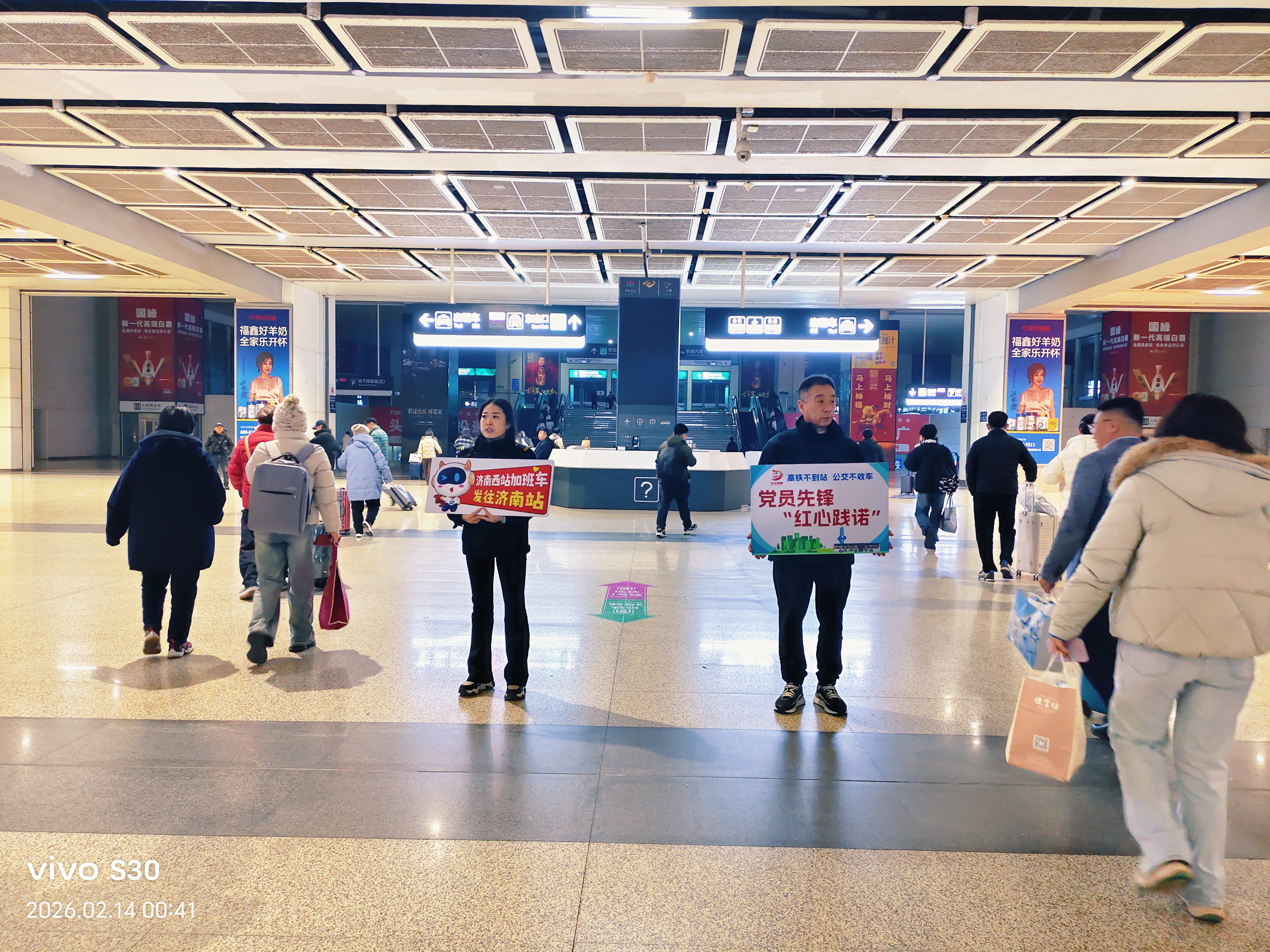 济南公交西部分公司得知凌晨临时列车加开信息后,迅速启动应急预案,在车辆调配、人员安排上做好周密部署,预留充足应急运力和备用驾驶员,确保接驳服务无缝衔接。调度员实时监控列车到站动态,第一时间向各岗位下达应急指令,一场深夜护航行动迅速展开。列车到站后,驾驶员周广亮、侯素俊等工作人员手持指示牌,迅速前往出站口接引旅客,热情引导:“前往市区的旅客请跟我来,公交加班车已在等候!”他们耐心解答线路咨询、帮扶携带大件行李的旅客,引导大家有序换乘。加班公交车旁,驾驶员们已完成车辆安全检查,微笑迎接每一位旅客,用暖心话语送上新春祝福。