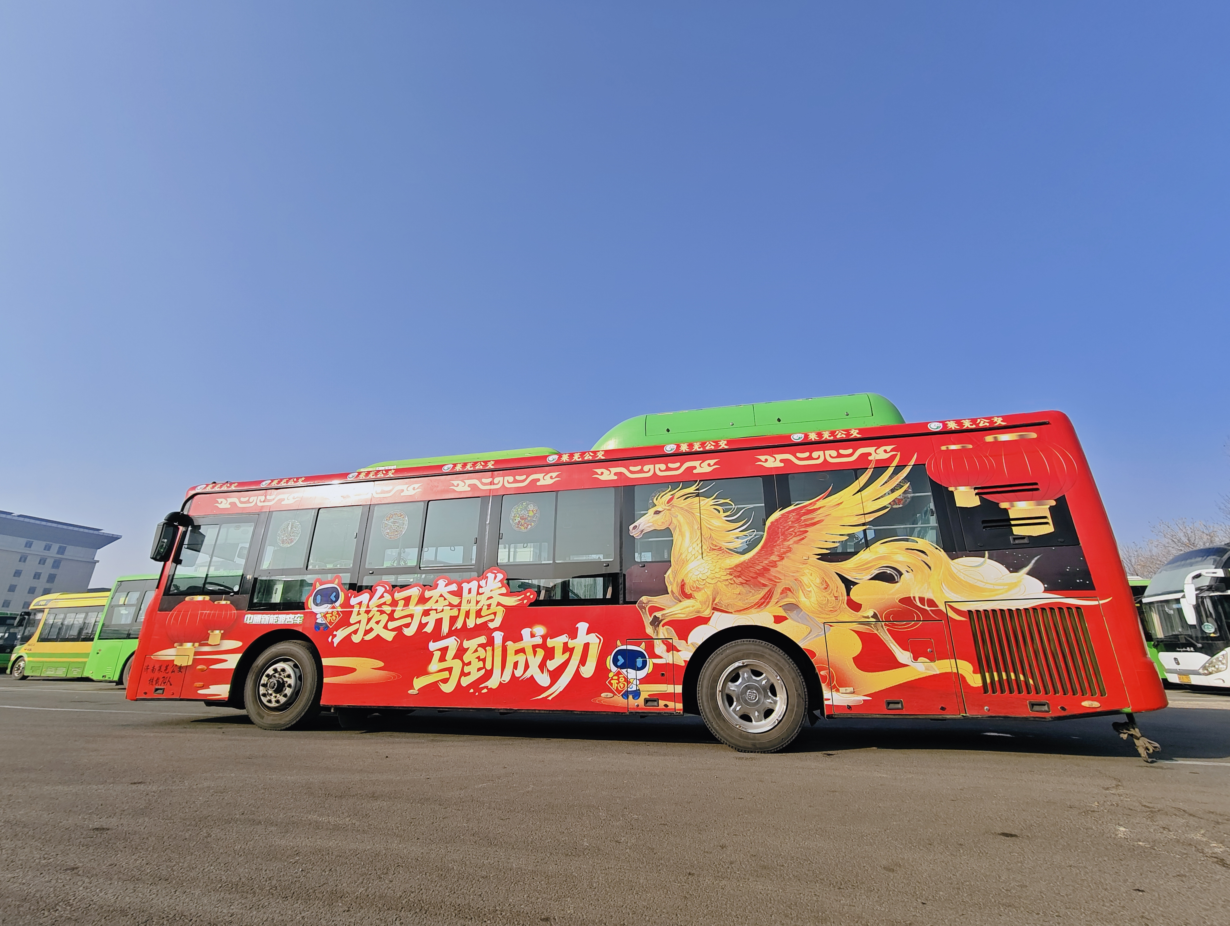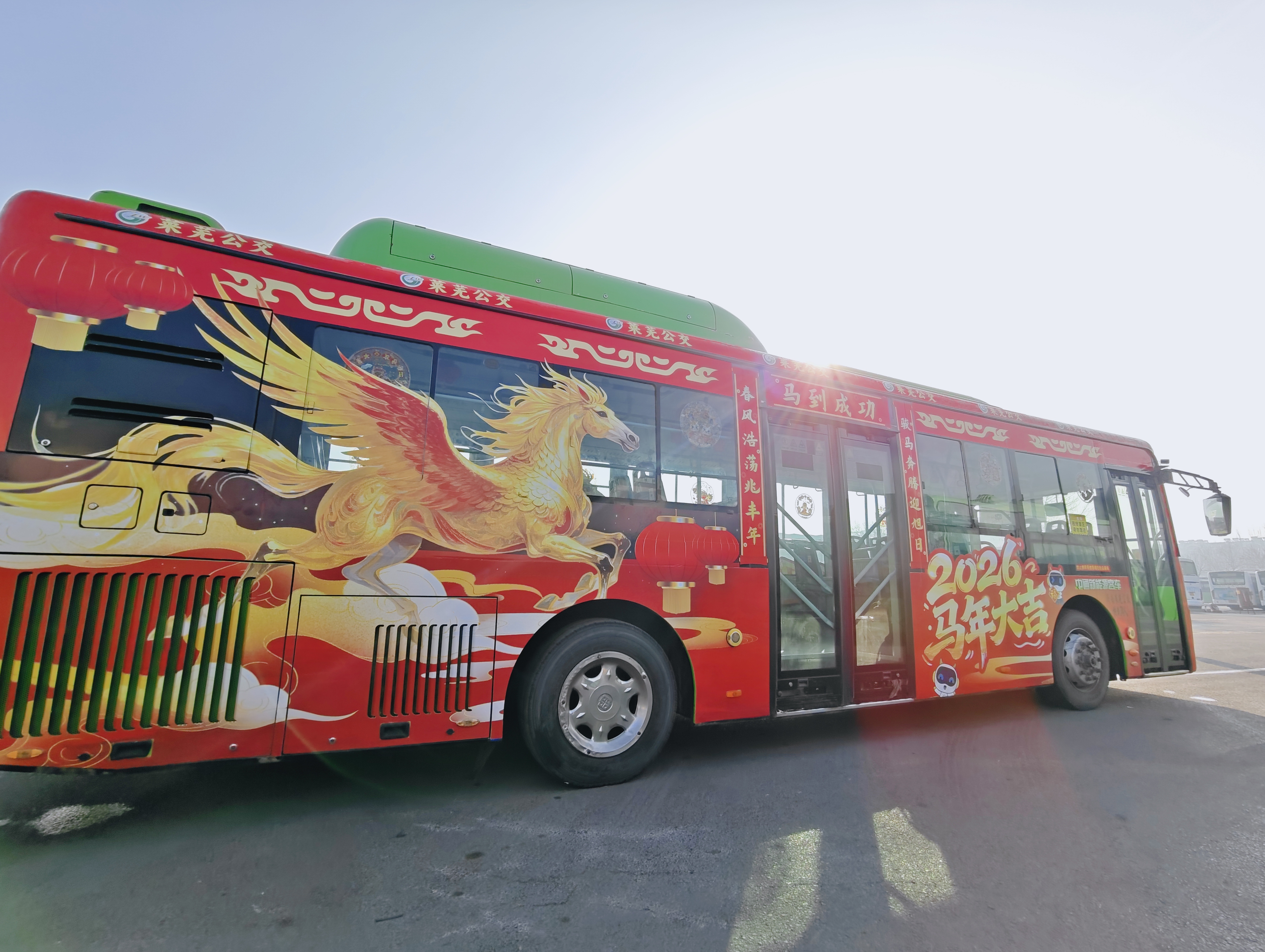 如果说贺岁候车亭是静候您的风景,那么在城区穿行的K8路“马年贺岁主题车”,就是驶向您的一路欢歌。身披锦绣“新装”的公交车,以昂扬奔腾的骏马形象为核心,配以“马年大吉、马到成功”祝福语,寓意新年一马当先、前程似锦,成为了城区最引人注目的“移动祥瑞”。