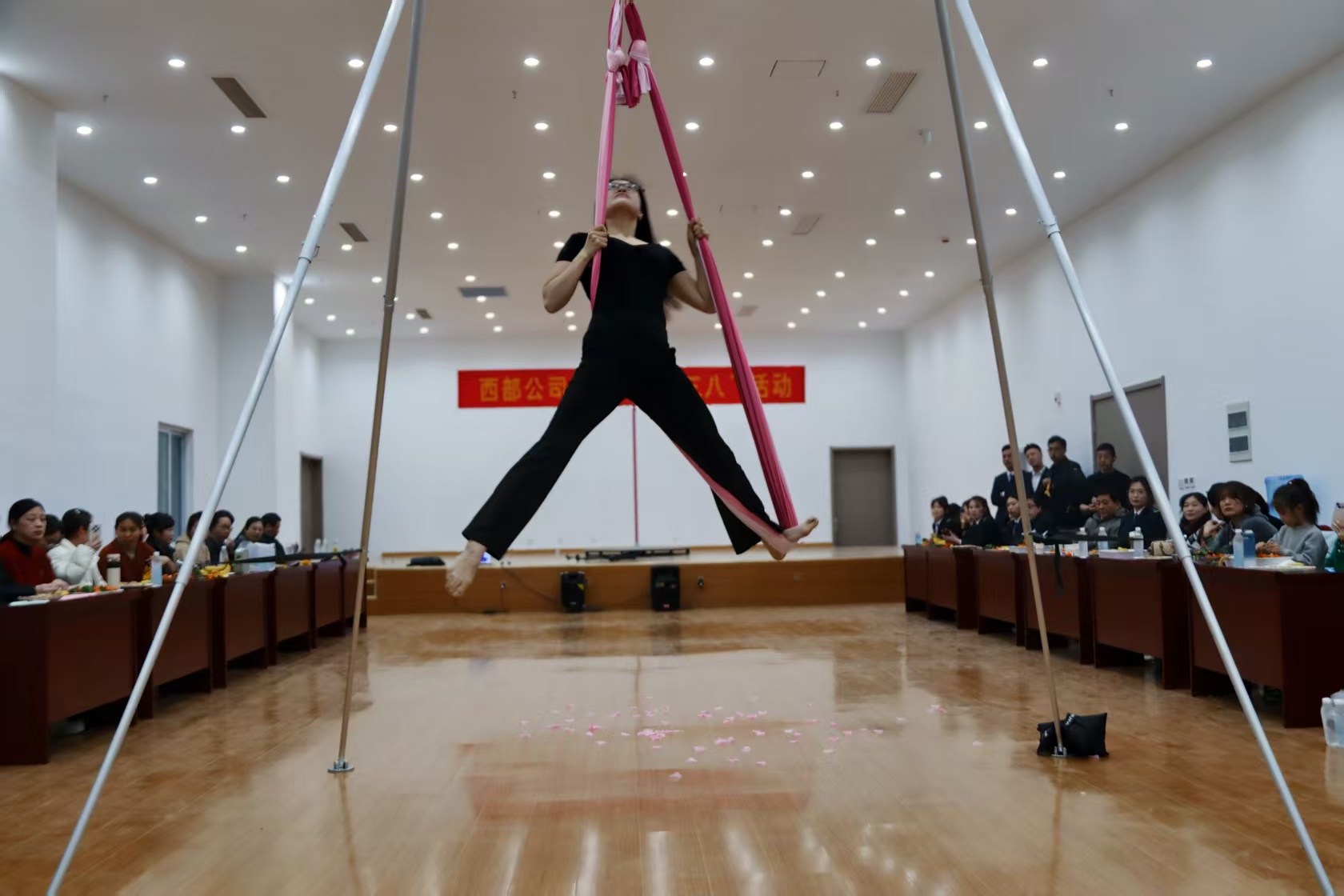 瑜伽体验结束后,茶话会与文艺展演精彩上演。公司模特队带来专业的集体走秀与个人秀,步伐优雅、身姿挺拔,尽显公交女职工的飒爽风采;歌舞节目轮番登场,旋律悠扬、舞姿灵动,赢得现场阵阵掌声;瑜伽老师带来的空中瑜伽表演,更是将现场氛围推向高潮。活动中,张书记向全体女职工致以节日的问候与美好祝福,大家围坐品尝鲜果、畅谈交流,现场欢声笑语不断,暖意融融。