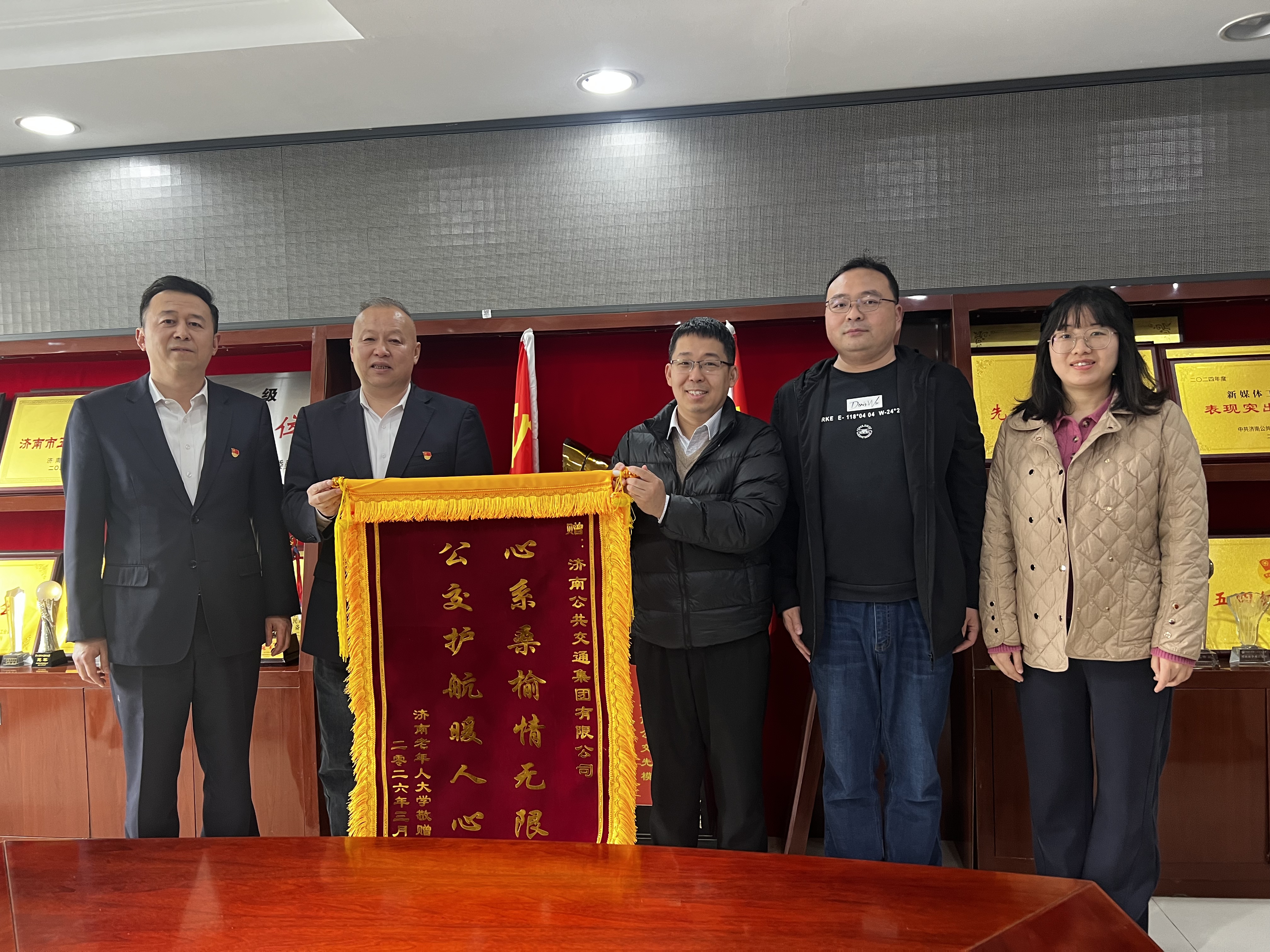济南公交官网讯 春寒未消,暖意融融。3月30日下午,济南老年人大学副校长赵冰一行,带着学校工作人员与学员代表的诚挚谢意,专程来到济南公交集团南部分公司,将一面印着“一面锦旗传温情 公交助老暖人心”的锦旗送到分公司,对济南公交始终心系老年乘客、精准优化线路、贴心保障出行表示衷心感谢。