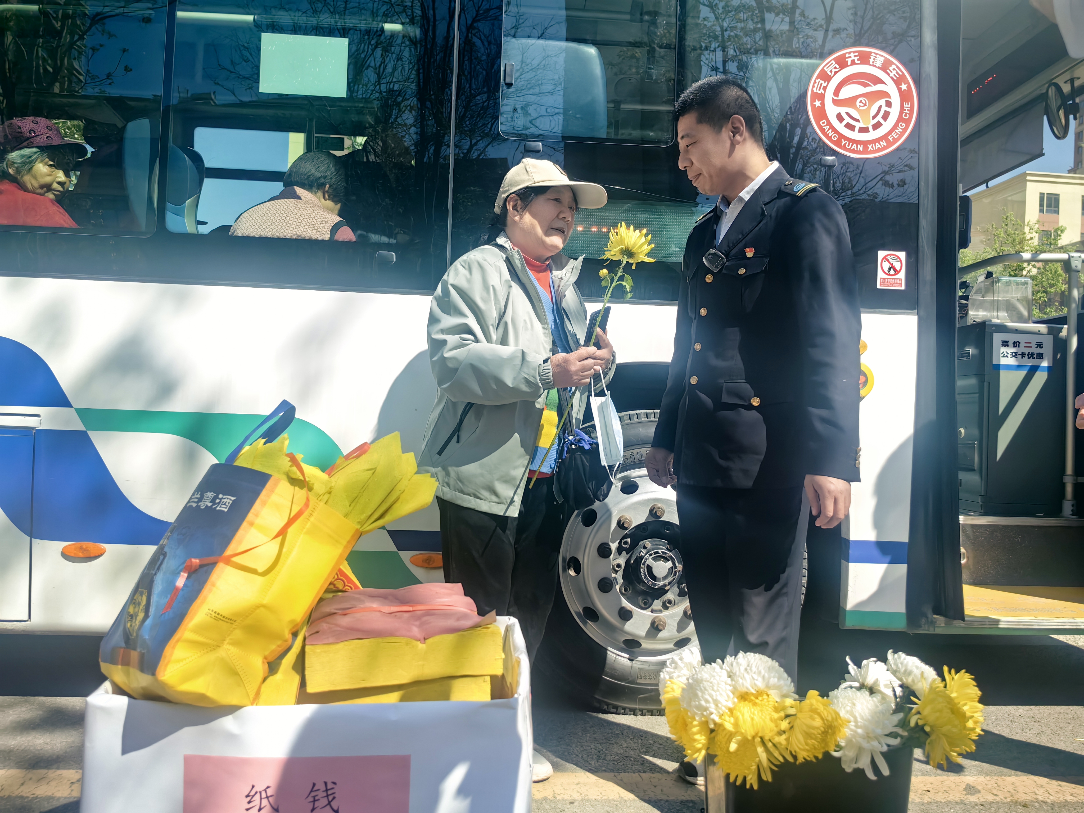 “大爷,清明节咱们提倡文明祭扫,这束菊花送给您,用鲜花祭扫安全、环保,同样能表达我们对先人的追思与敬意……”在专线发车现场,志愿者郭斌、杜亮、王辉等忙碌的身影成为一道亮丽的风景线。车队设置“纸钱回收箱”,志愿者们耐心倡导村民“以花换纸,文明祭扫”,摒弃焚烧纸钱的旧俗,改用鲜花寄托哀思。这一举措不仅从源头上消除了春季干燥带来的火灾隐患,减少了环境污染,更让村民在保留仪式感的同时,自然而然地接受了环保、低碳的祭扫方式。