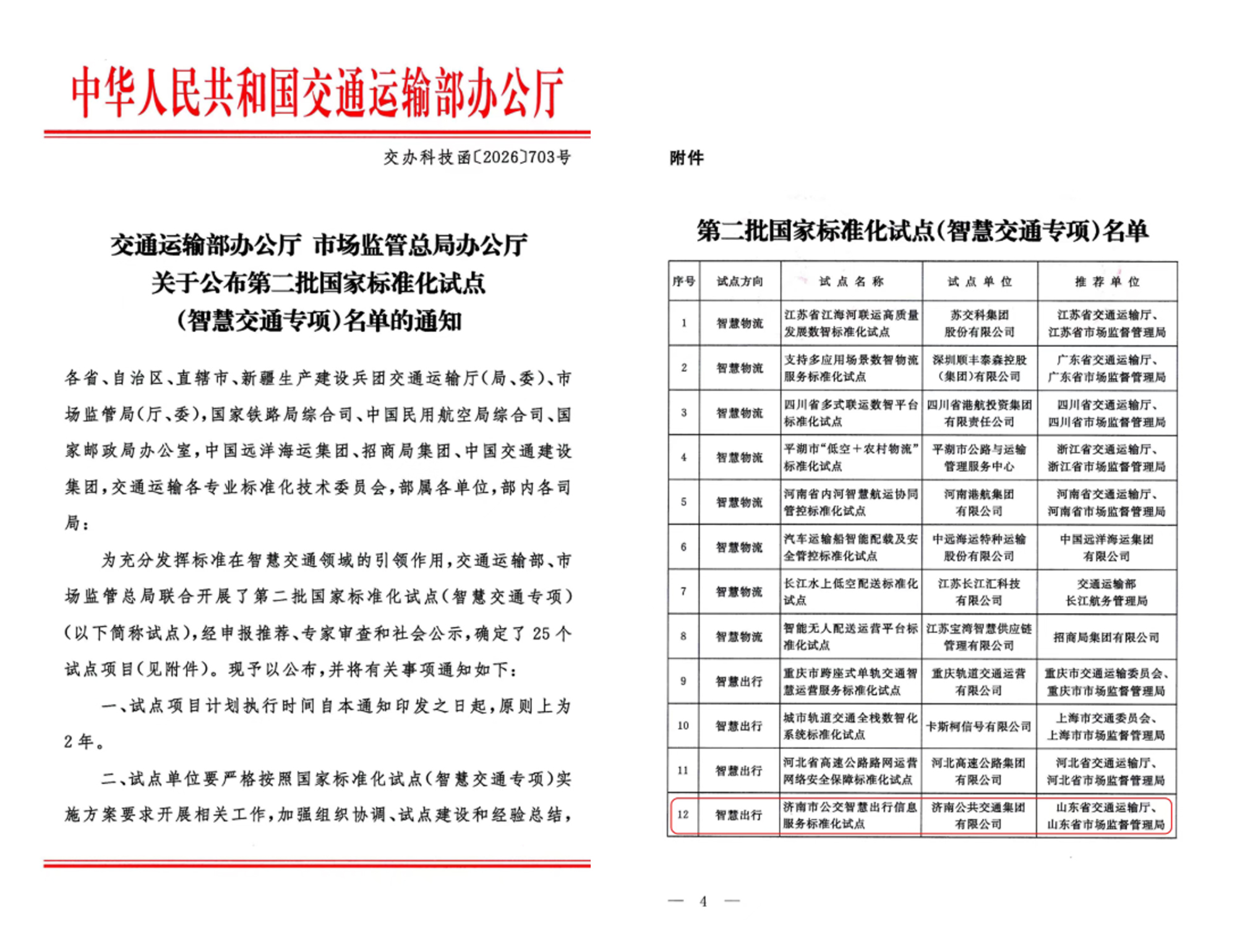 为充分发挥标准在智慧交通领域的引领作用,交通运输部、市场监管总局联合开展了第二批国家标准化试点(智慧交通专项),经试点征集、申报推荐、专家审查和社会公示,确定了25个试点项目,包括智慧物流试点项目8项、智慧出行项目6项、新型基础设施11项。全国仅两家公交企业入选试点名单。济南公共交通集团有限公司承担的“济南市公交智慧出行信息服务标准化试点”脱颖而出、成功入选。