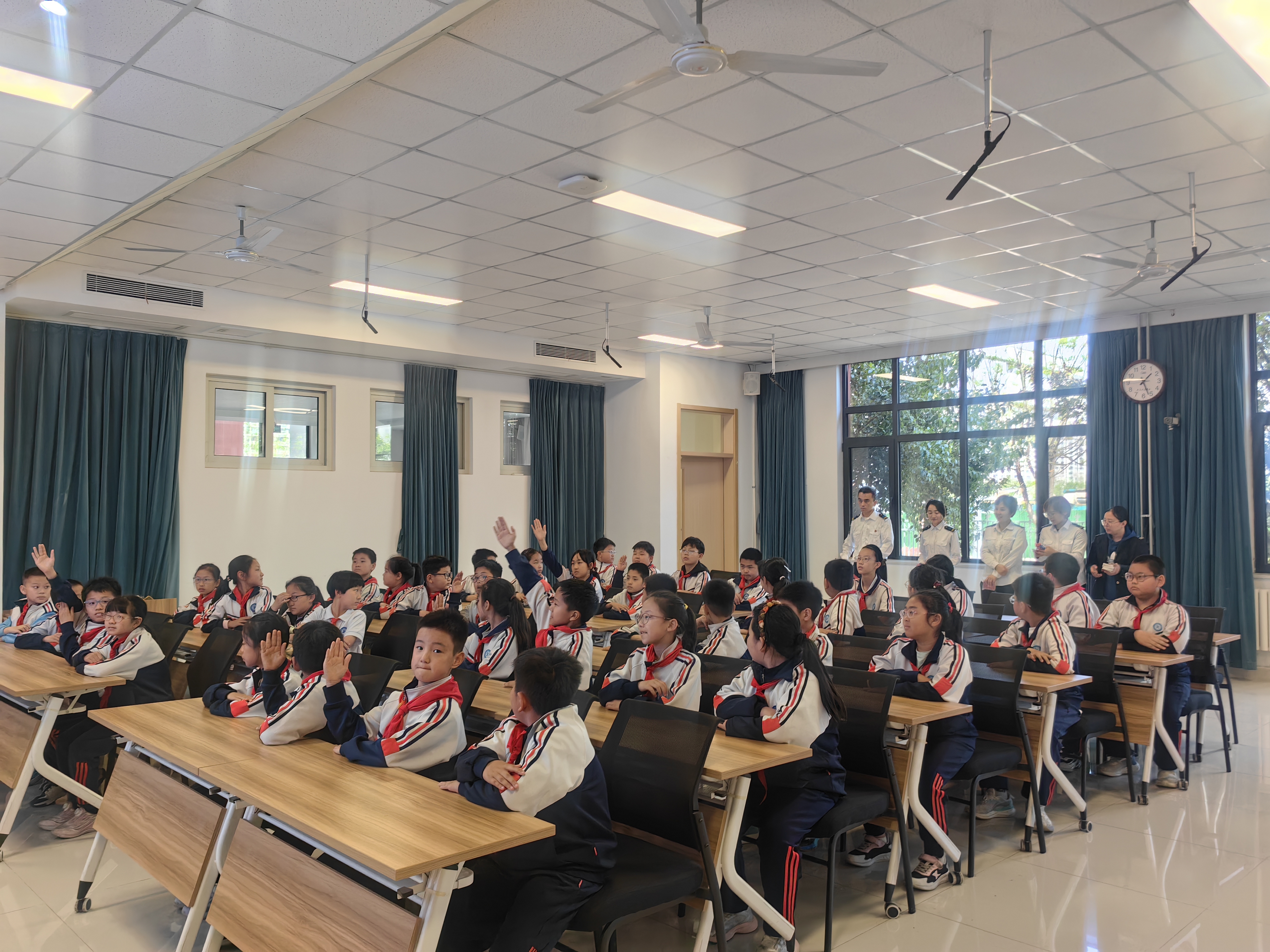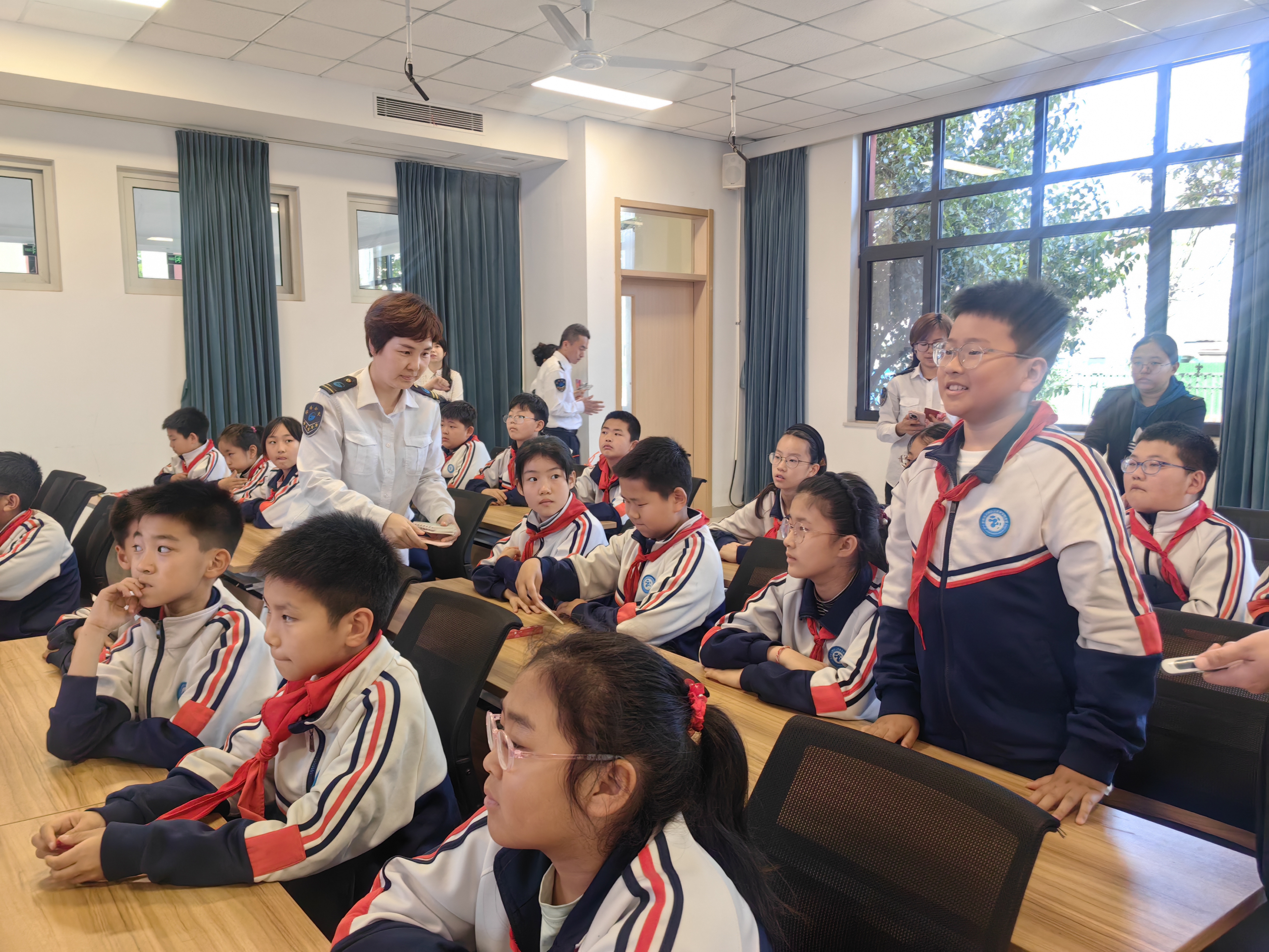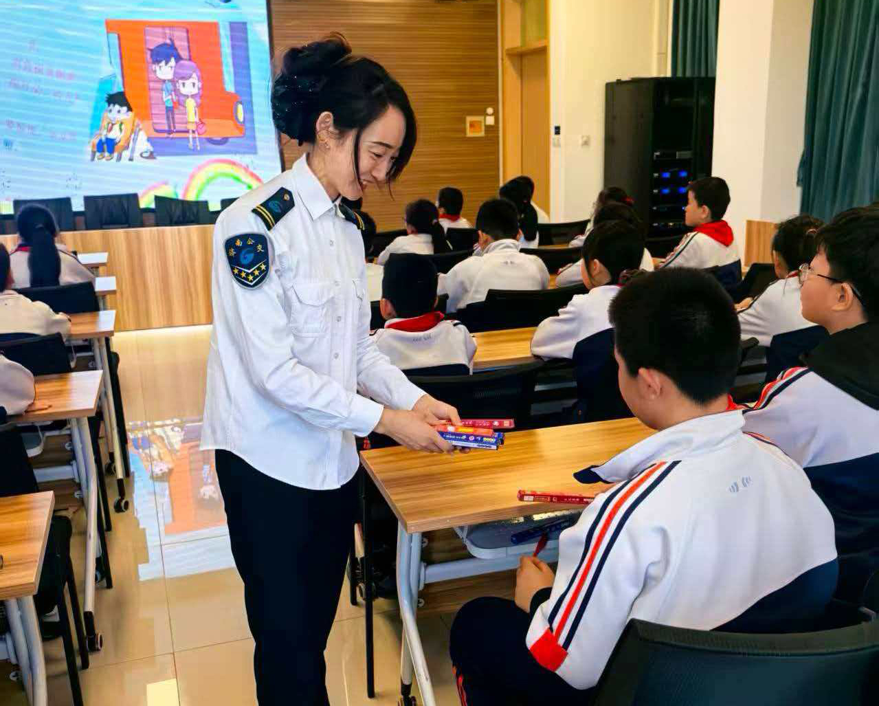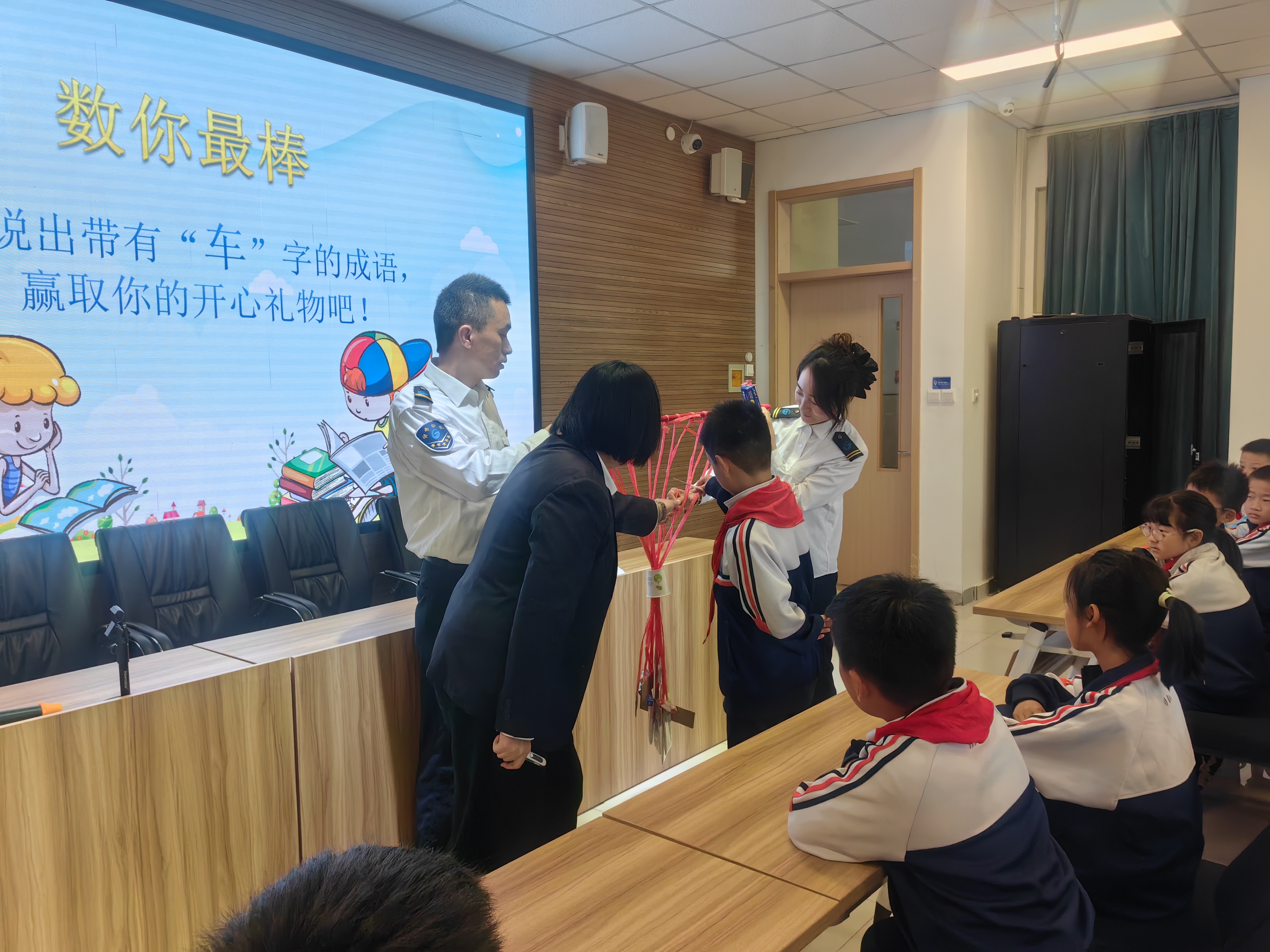 为提升教学效果,宣讲团队采用动画演示的形式,直观系统地讲解了公共交通乘车规范、非机动车骑行安全及用电安全等常识。随后,李晓玮、廖冠军通过有奖问答的形式对所学知识进行检验与巩固,并为表现优异的学生发放纪念品,实现了从“被动听”到“主动学”的转变。