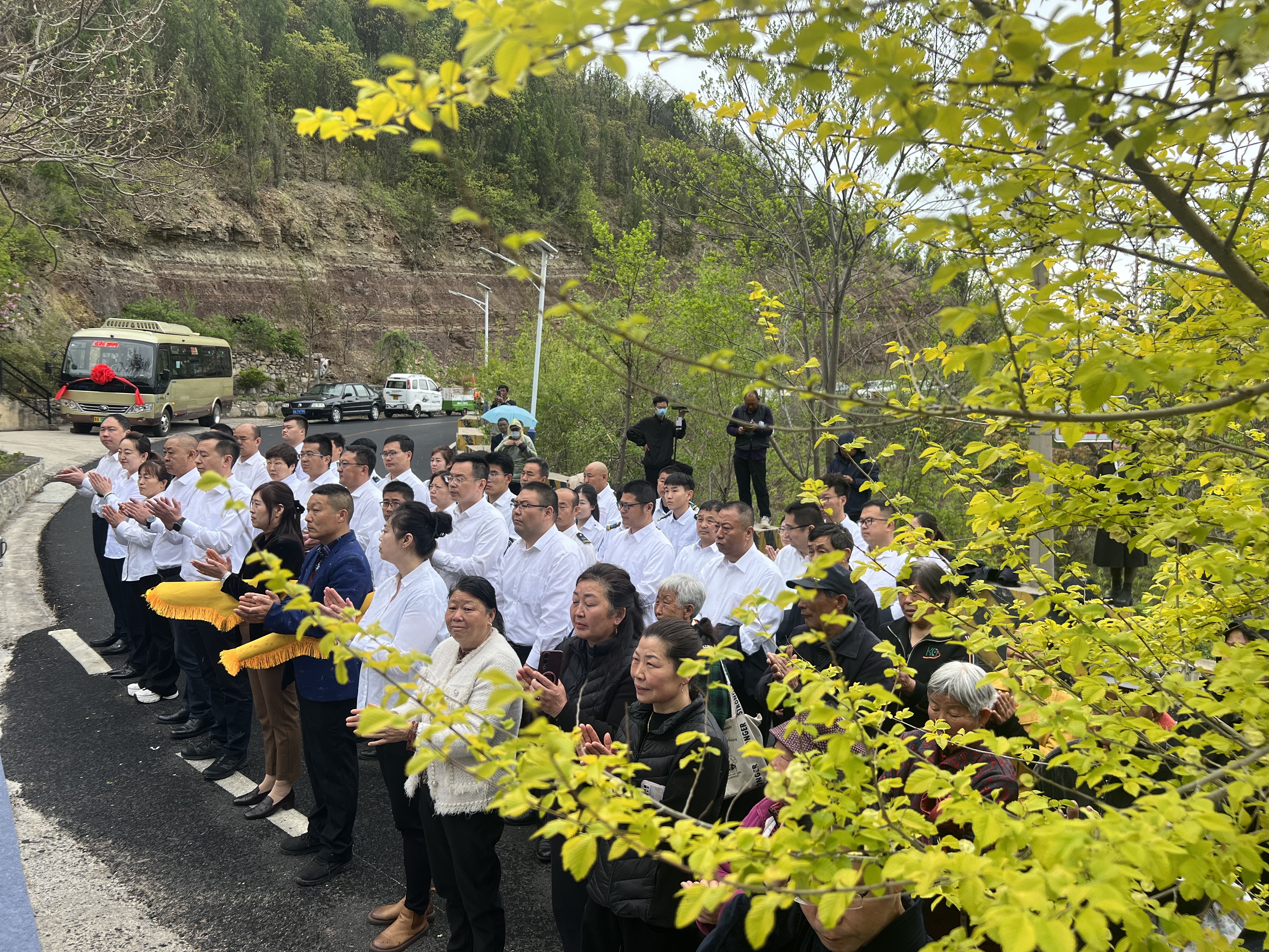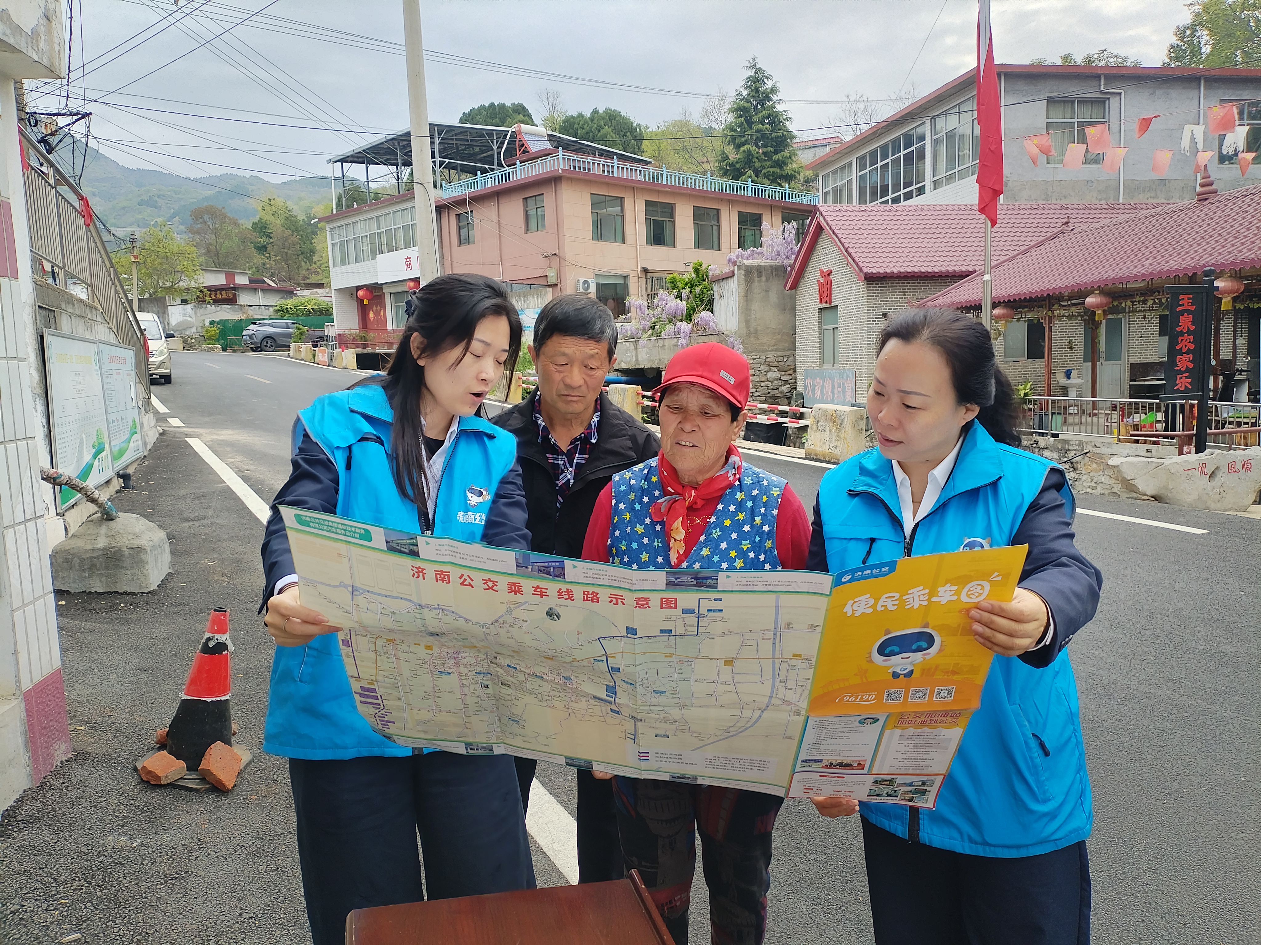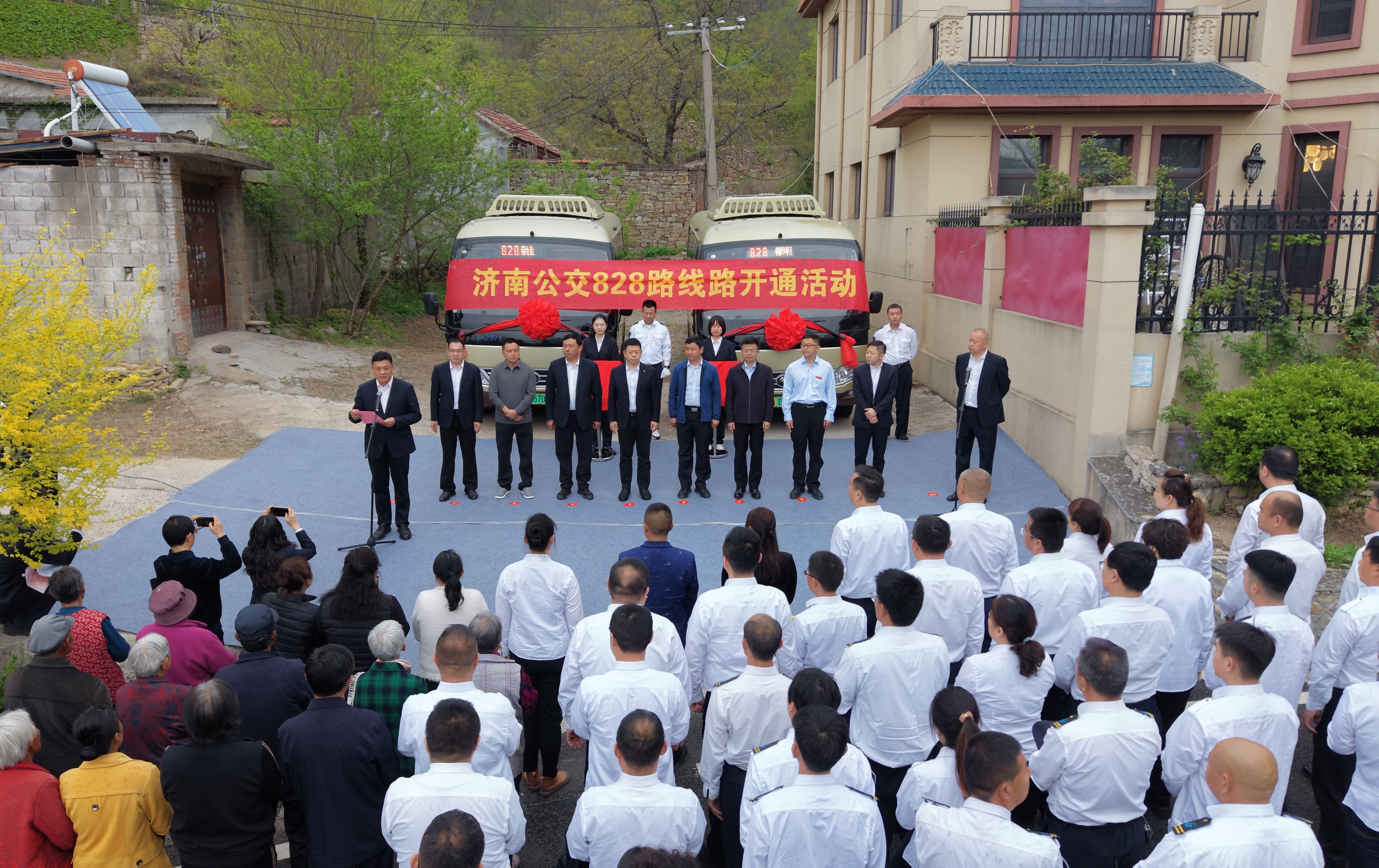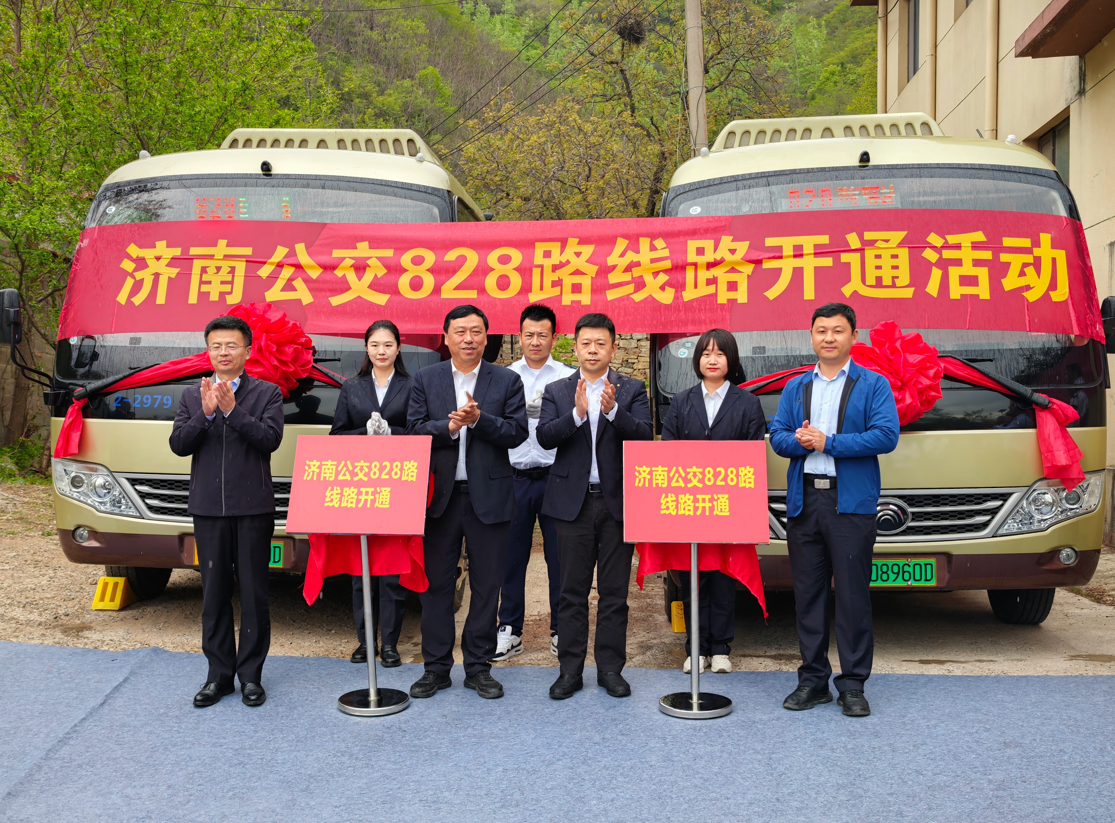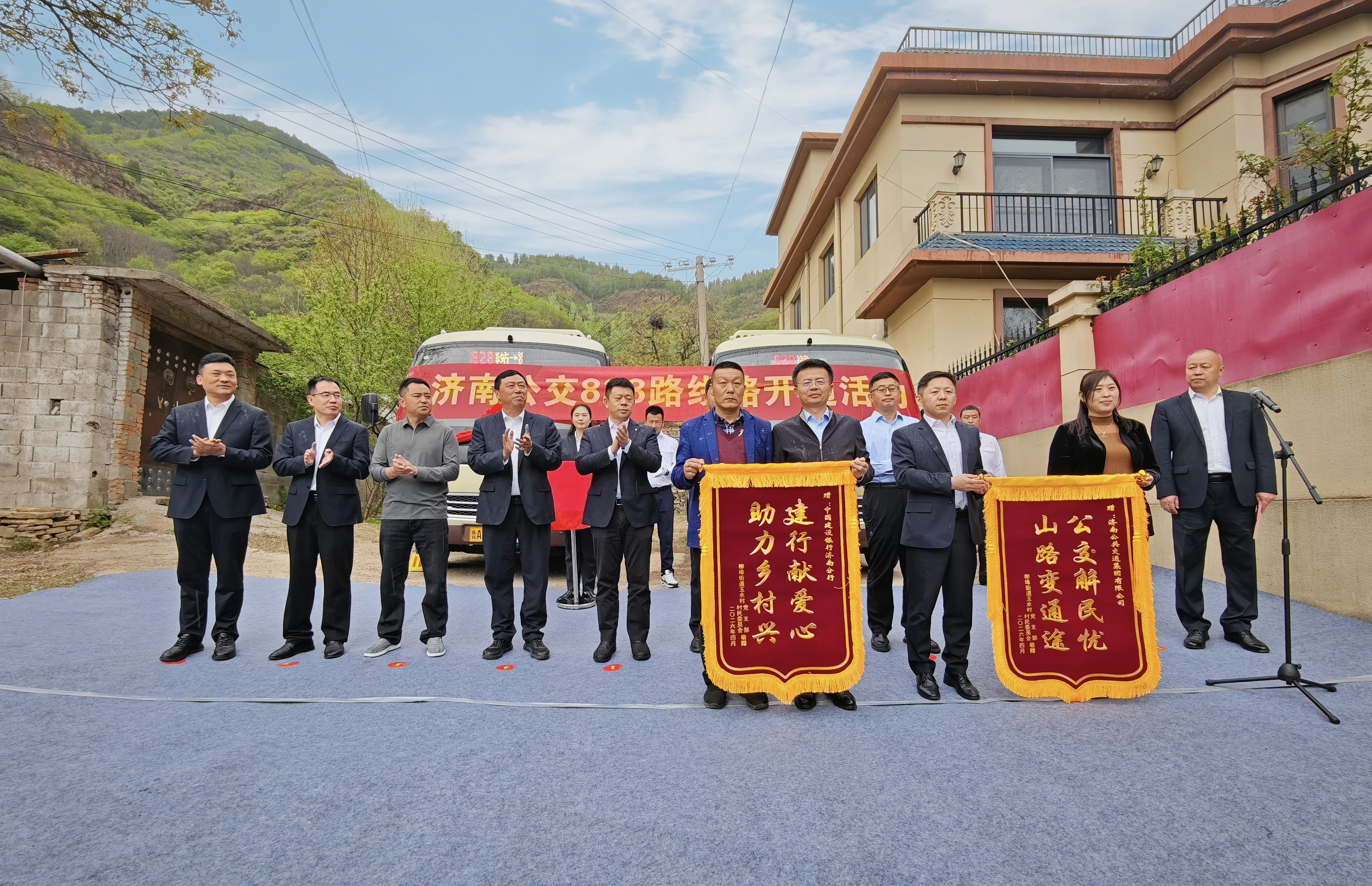 4月16日上午,济南公交南部分公司在柳埠街道玉水涝洼村举行828路线路开通活动。建设银行济南分行党委委员、副行长秦超,济南市南部山区柳埠街道党工委副书记、办事处主任薛瑞光,济南公交集团副总经理、工会主席谢刚等,柳埠街道玉水涝洼村居民及南部分公司职工代表共同参加。活动现场还设置了服务台,蓝马甲出行管家现场听取市民意见建议,宣传定制公交、优惠换乘等惠民政策,并向市民赠送公交便民地图。