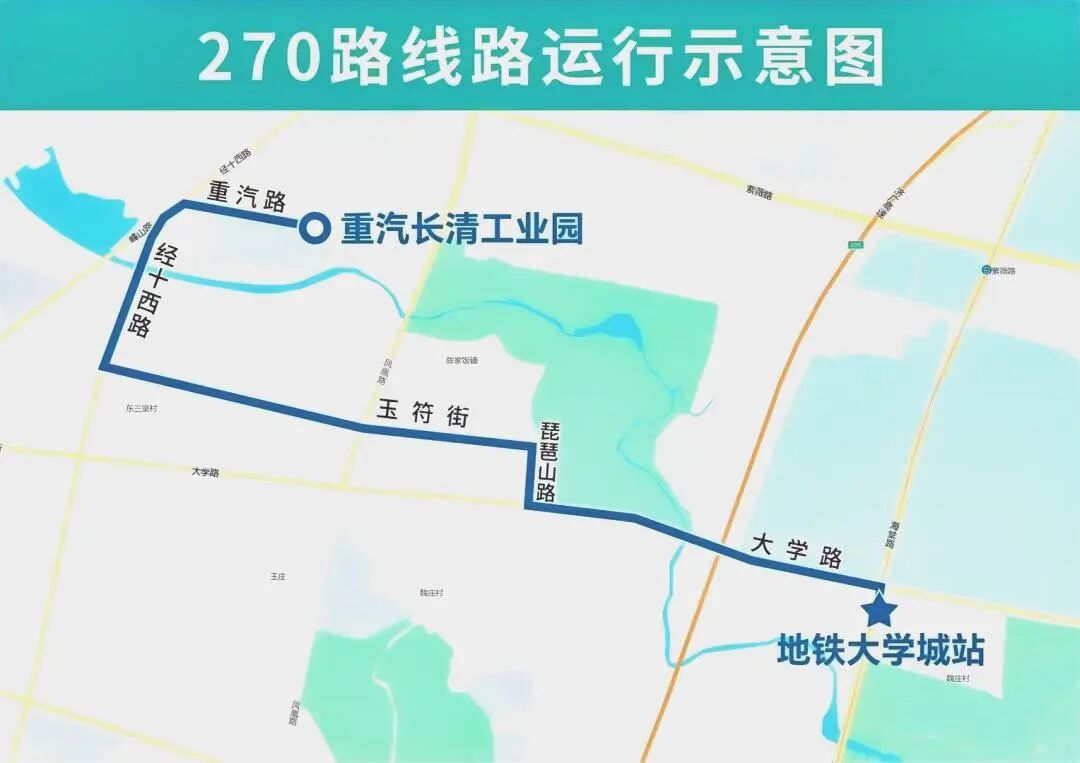 济南公交官网讯 为持续做好线网优化工作,加强长清玉符街、重汽路沿线区域与地铁1号线的接驳,做好长清驻地企业通勤保障,今天,济南公交开通试运行270路。