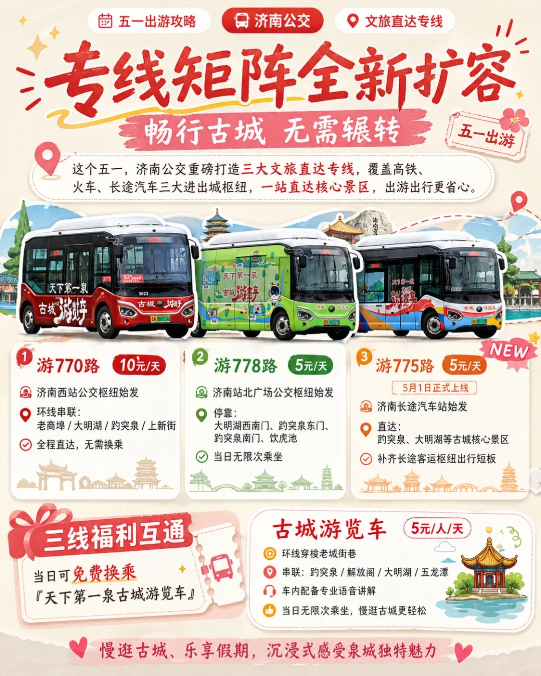 济南公交官网讯 春风十里赴泉城,美好“五一”正当时!“五一”小长假将至,为全力满足广大市民游客出游需求,深化公交+文旅融合发展,济南公交全面升级文旅出行服务矩阵,扩容景区专线、优化出行网络、叠加惠民福利,邀八方宾客乘公交、逛古城、赏泉韵,一张车票轻松解锁泉城绝美风光!