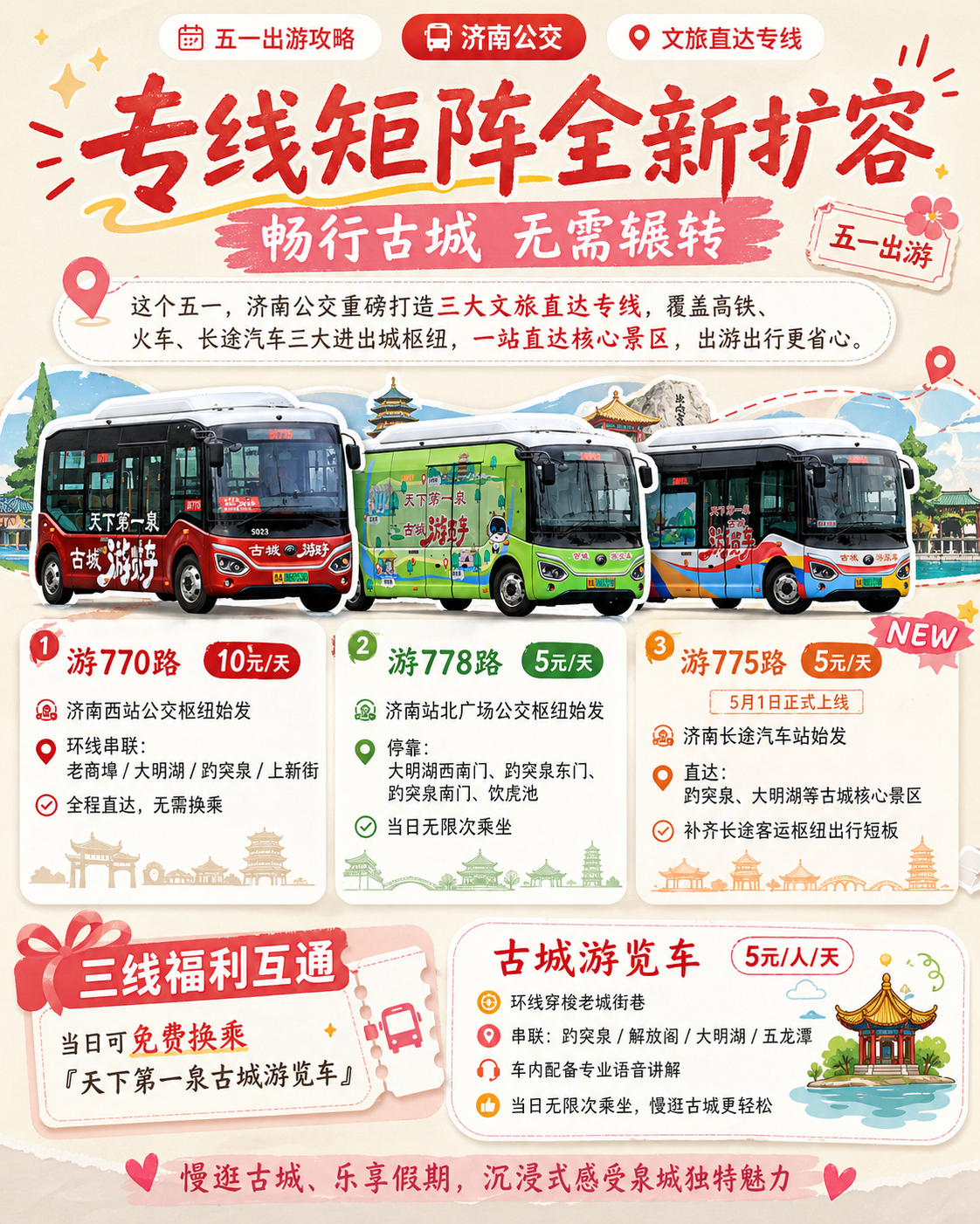 5元/天(游770路10元/天)即可当日无限次乘坐,慢逛古城、乐享假期,沉浸式感受泉城独特魅力。
