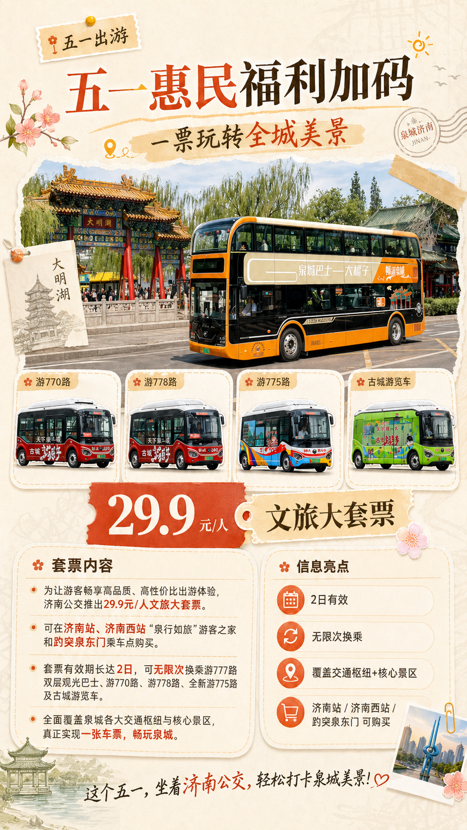 为让游客畅享高品质、高性价比出游,济南公交推出29.9元/人文旅大套票,可在济南站、济南西站“泉行如旅”游客之家和趵突泉东门乘车点购买,套票有效期长达2日,可无限次换乘游777路双层观光巴士、游770路、游778路、游775路及古城游览车,全面覆盖泉城各大交通枢纽与核心景区,真正实现一张车票,畅玩泉城。