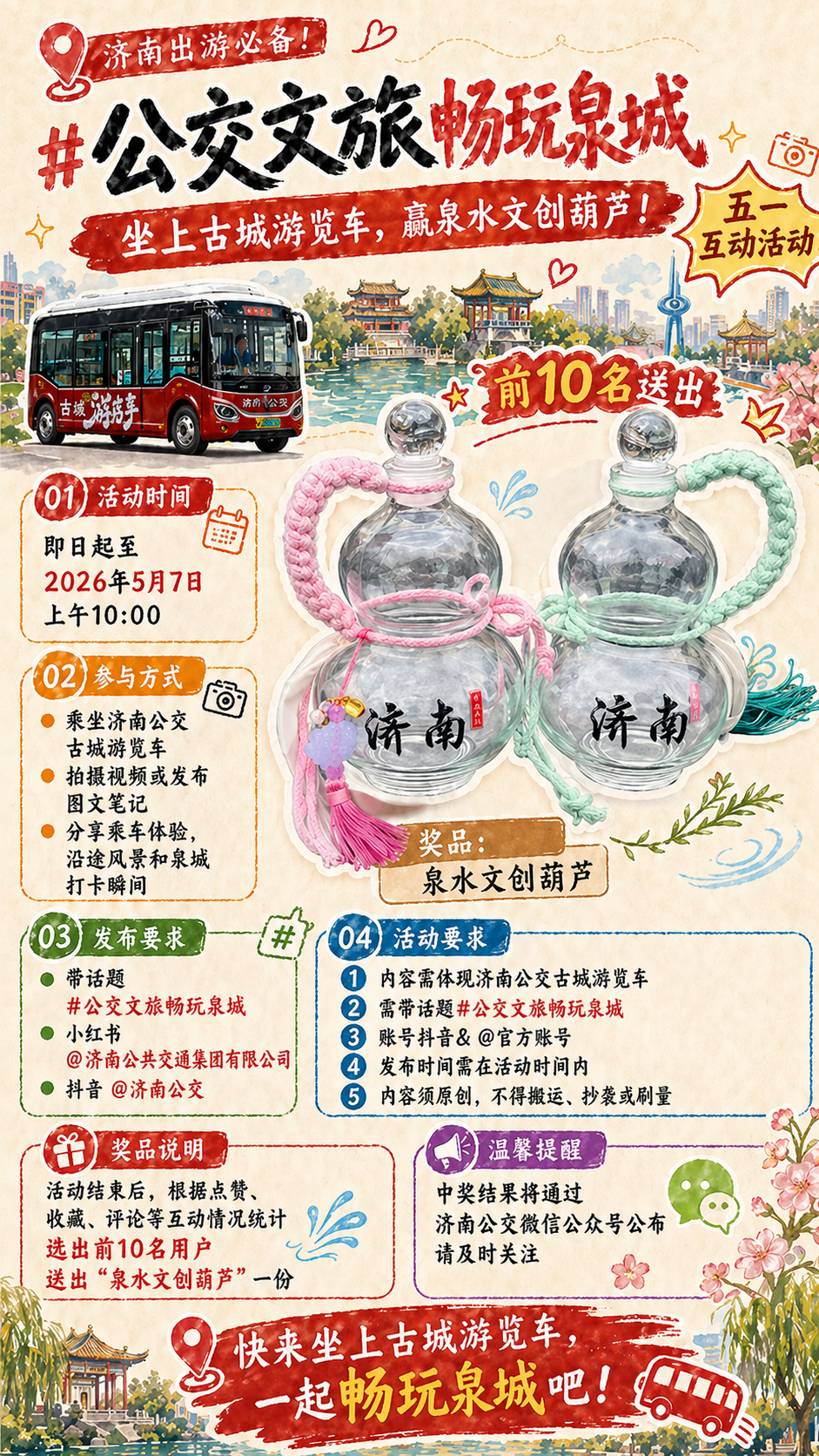 公交为媒赴春约,不负“五一”好风光。这个假期,济南公交以优质线路串联泉城美景,以暖心服务赋能文旅发展,全力擦亮泉城特色文旅名片。诚邀广大市民游客前来打卡体验,搭乘公交文旅专线漫游古城,尽赏山色湖光,共度惬意“五一”假期。