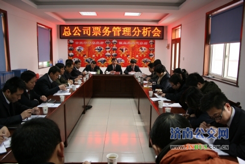 济南公交官网讯 3月14日上午,总公司2012年2月份票务管理会议在恒生公司四队会议室召开。会议由总公司总经理助理金建勇主持,总公司票务管理部部长杨国英、稽查大队队长王晓刚、指挥中心主任童立江,各营运公司营运经理、营运管理部部长、经营管理部部长、安保公司经理参加了会议。
