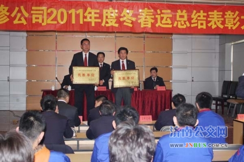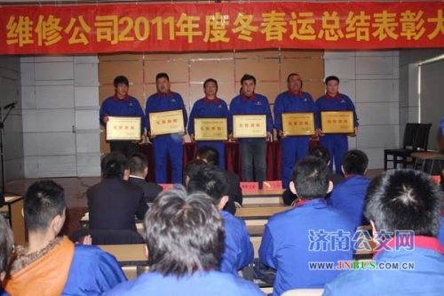 济南公交官网讯 3月20日下午,维修公司召开2011年冬春运表彰会同时启动了“大力弘扬雷锋精神、熔铸公交服务品牌、创建全国文明城市”竞赛活动仪式。维修公司及公司班子成员、各级管理人员、一线员工代表共100余人参加了会议。会议由公司党委副书记、工会主席车立山主持。