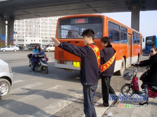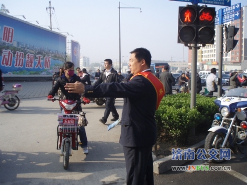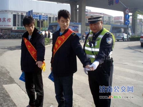 4月13日,早高峰期间,快速公交一队驾驶员与天桥区交警大队的交警一起,在黄岗路口维持运营秩序,并向市民发放《安全行车宣传单》,提醒驾驶人员遵循行人优先通行的原则,养成遵章驾驶,文明行车的习惯,努力创造安全、畅通、文明、和谐的交通出行环境。