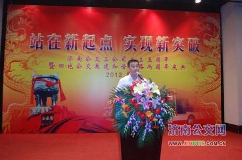 庆典仪式上,济南市交通运输局副局长、公交总公司党委书记、总经理薛兴海同志发表了热情洋溢的欢迎辞。薛总指出济南公交三公司成立五年来,各项工作取得了长足的发展与进步,拓宽了济南公交的服务领域,方便了城乡居民的出行,为我市经济社会发展做出了积极贡献。他希望广大干部职工要进一步开拓进取,扎实工作,谱写出公共交通事业发展的新篇章。山东建筑大学副校长韩锋、唐山公交副总经理张建分别代表济南东部大学以及共建单位致贺词。济南公交三公司党委书记、经理曲修业介绍了公司发展情况。