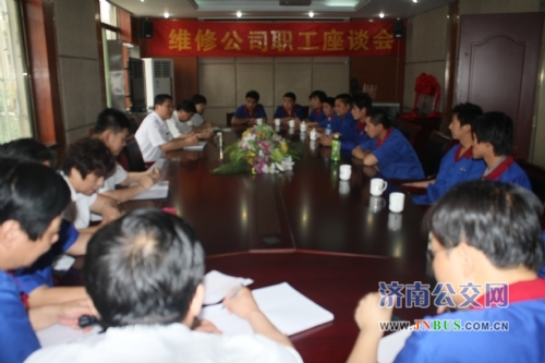 济南公交官网5月30日讯 为贯彻落实总公司《“面对面,心贴心,实打实服务职工在基层”活动实施意见》,听取职工意见及建议,及时把握职工思想动态,帮助职工解决工作和生活中的实际困难。5月29日上午,维修公司在二楼会议室召开了一线职工座谈会。公司党委副书记、工会主席车立山、副经理张东业、孔建华及机关各部门负责人和一线职工参加了会议。