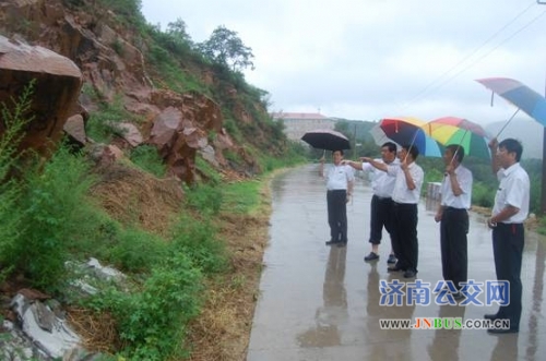 济南公交官网讯 8月3日上午,受台风“达维”影响济南市普降中到大雨。总公司副总经理姜良、安全保卫部部长赵德荣、营运市场部部长邓军航冒雨视察了南部山区各危险路段。
