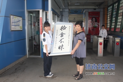 丢失了东西之后的王女士非常着急,正为身份证、银行卡的补办忙的焦头烂额,收到站务员打来的电话,万分感激。9月6日,王女士特意请精通笔墨的画家丈夫写了一副题有“拾金不昧”的字画,送给东泺河站务员李娇彦和贺芳,表达自己的感激之情。