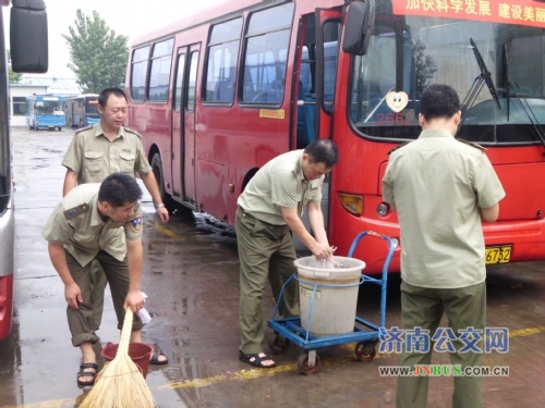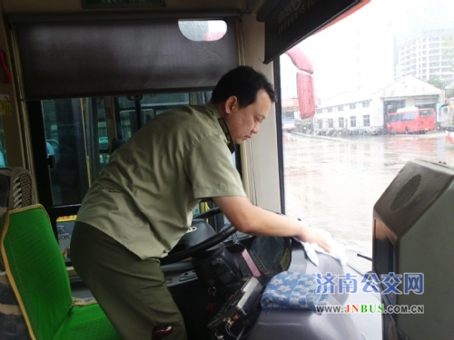 2012年9月7日早上9点多钟,济南市交通局监察支队政委王继强带领监察人员来到公交一公司五队,帮助公交职工打扫车辆卫生。看到监察员有的擦车皮,有的清理仪表盘,有的拖地板,有的擦座椅干得热火朝天,驾驶员们也主动拿起工具和监察员们一起清洁车辆。王政委一边打扫着车辆卫生一边询问着公交员工的生活和工作情况,虽然汗水湿透了衣衫但笑容一直挂在脸庞。