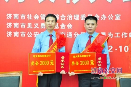 济南公交官网讯 10月12日,济南市公共交通系统见义勇为表彰大会在济南市公交分局召开,对济南市公共交通系统涌现的见义勇为先进分子和积极分子进行了表彰。济南恒通汽车服务股份有限公司爱心车队队员李智勇、何华友被济南市公安局公共交通分局授予“见义勇为积极分子”称号并被分别给予两千元现金奖励。“路见不平伸手相助,本身就是我们应该做的,我会把这些奖金陆续捐给社会上需要帮助的人,同时也会带动更多的驾驶员多做好事。”会后何华友表示。