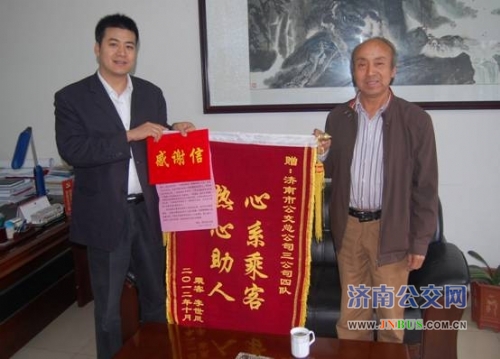 济南公交官网讯 10月16日上午,家住天桥区矿院路山东科技大学宿舍的房老师代表老伴及家人来到三公司驻地送来锦旗和感谢信,感谢公交员工的热心帮助。