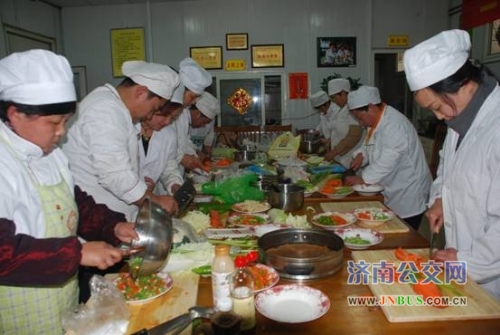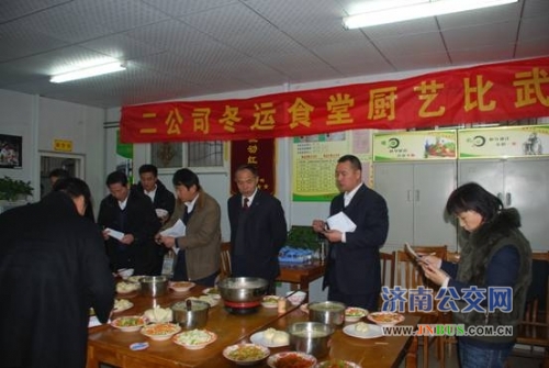 济南公交官网讯 为积极做好员工小食堂工作,提高食堂饭菜质量,保障一线员工吃热、吃饱、吃满意,29日下午,二公司在汽车三队职工食堂举办了“冬运食堂厨艺比武”,来自各车队的10名食堂工作人员参加了这次比武。
