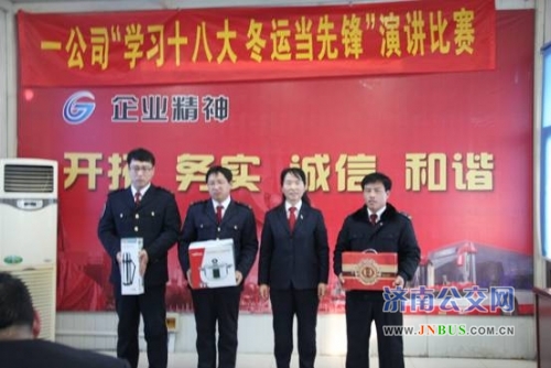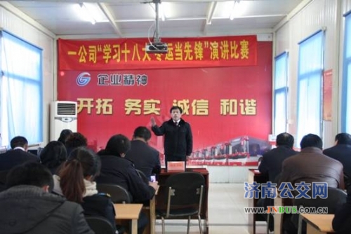 济南公交官网讯 为积极响应总公司党委号召,深入学习宣传贯彻党的十八大精神,切实把广大职工的思想统一到十八大精神上来,2012年12月18日下午,一公司在汽车五队会议室举办了“学习十八大 冬运当先锋”演讲比赛。一公司党委副书记、工会主席李秀珍,各车队副书记以及职工代表共计50余人参加了活动。