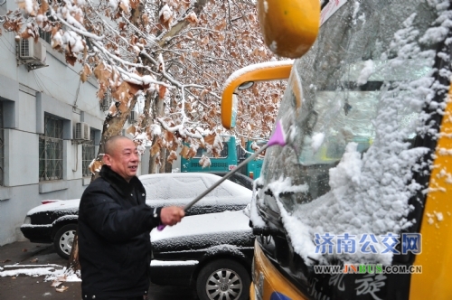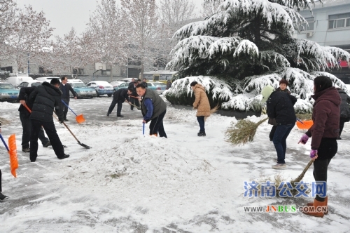 济南公交官网讯 12月21日,济南迎来入冬以来第一场大雪。一大早,恒通公司机关全体管理人员提前准时到岗,在公司经理王效忠为首的领导班子带领下,大家或手持铁锨、或拿起雪铲,迎着刺骨的风雪,将院内积雪打扫干净,保障今天160辆出租车收费、自检工作的正常进行。
