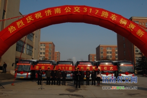 济南公交官网讯 12月26日上午,济南公交在山东建筑大学举行317路线车辆更新仪式。山东建筑大学副校长韩峰、校办主任刘云栋、宣传部部长杨赟、学生处处长赵明吉、保卫处处长李孟忠、团委书记张念军、新闻中心主任李增义、后勤处处长刘青峰、后勤处书记李明延、后勤处副处长尹继宝出席仪式。济南公交总公司副总经理石绍滕,副总经理姜良,总公司安全保卫部部长赵德荣、副部长尹晓申,营运市场部部长邓军航、副部长孙涌,稽查大队队长王晓刚、维修公司经理王培海、技术部副部长田锡庆及三公司管理人员、驾驶员代表、共80余人参加仪式。仪式由总公司副总经理姜良主持。