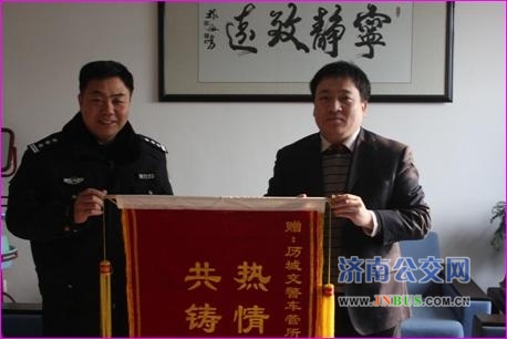快速公交公司来到在BRT车辆年审工作中给予大力帮助的历城交警大队车管所及济南正元机动车检测中心等单位,送上锦旗以示感谢。历城交警大队车管所所长孙晶对快速公交公司对待车辆年审工作的高度重视与积极配合表示感谢,希望双方在未来的工作中继续延续融洽的合作关系,车管部门将按照“严格执法、热情服务”的目标要求,全心全意为济南公交服好务。