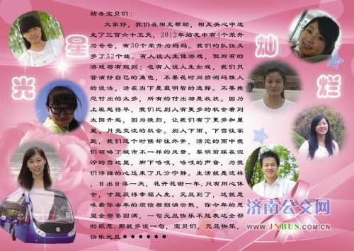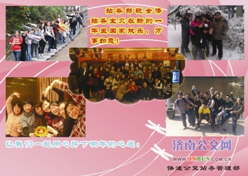 济南公交官网2013年1月1日讯 2013年元旦当天,快速公交站务管理部全体管理人员上站上线,走访慰问节日期间在站台工作的站务员们。为感谢员工们一年来的辛勤工作,部门自行设计了新年贺卡,以高星级站务员、微笑之星及职工集体活动的照片为背景,并附上新年寄语,既有温馨的回忆,又有对新年的期待与展望。站务员在贺卡中找到了自己或同事的身影,让大家倍感亲切和新颖。小小一张新年贺卡,既承载着一份关怀,同时也是一种鼓励,拉近了员工之间的距离。站务员们收到贺卡后,纷纷表示在新的一年里努力工作,积极争当高星级站务员,为公交发展再续新篇。