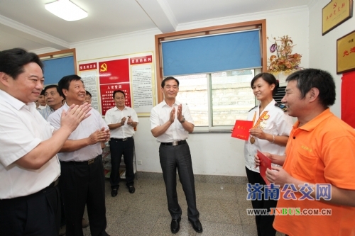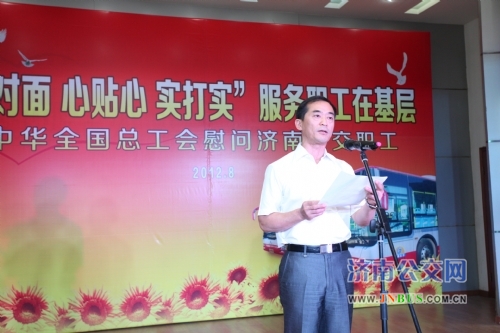 “面对面、心贴心、实打实服务职工在基层”是中华全国总工会今年开展的一项重要活动,是各级工会认真贯彻落实党的群众路线和走中国特色社会主义工会发展道路的要求,切实转变工作作风,充分发挥党联系职工群众的桥梁纽带作用的重要举措。仪式上,中国海员建设工会主席丁小岗向济南公交赠送帮扶资金二十万元,济南市交通运输局副局长、济南市公交总公司党委书记、总经理薛兴海代表济南公交作了表态发言,丁主席代表中华全国总工会做了重要讲话。仪式结束后,各位领导观看了济南公交职工文工团演出;乘坐K52路公交车,考察了济南公交微笑服务、车厢文化建设情况;视察了二公司三队站房文化、职工小食堂建设,在职工之家活动室亲切看望慰问了济南市劳动模范秦静和场站公司困难职工葛传金。