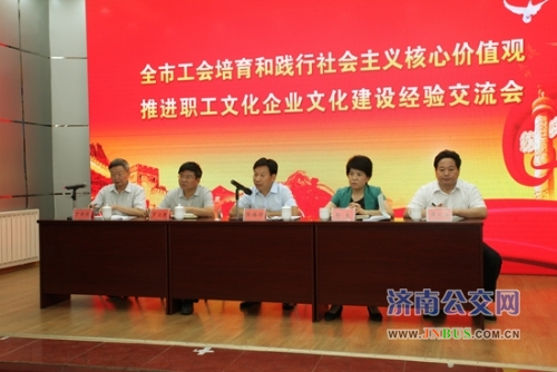 济南公交官网讯 8月28日下午,由市总工会召开的“全市工会培育和践行社会主义核心价值观,推进职工文化、企业文化建设经验交流会”在市公共交通总公司礼堂举行。市总工会常务副主席张福俭、市委宣传部副部长郅良、市交通运输局副局长罗卫东出席会议;市公共交通总公司党委书记、总经理薛兴海向大会致辞;来自各县(市)区总工会、局(公司)工会、大企业工会的70余名分管负责同志和宣教部长参加了会议。