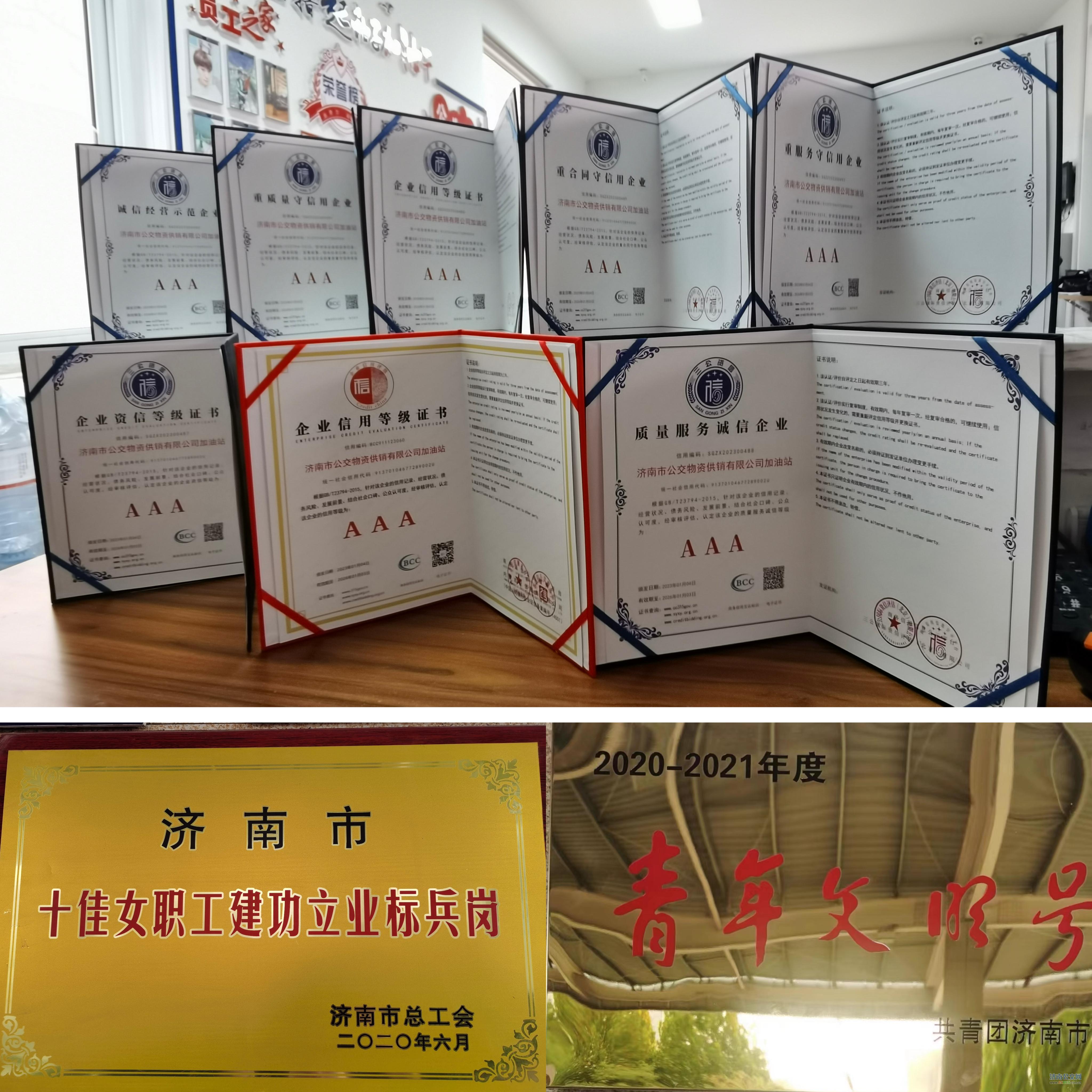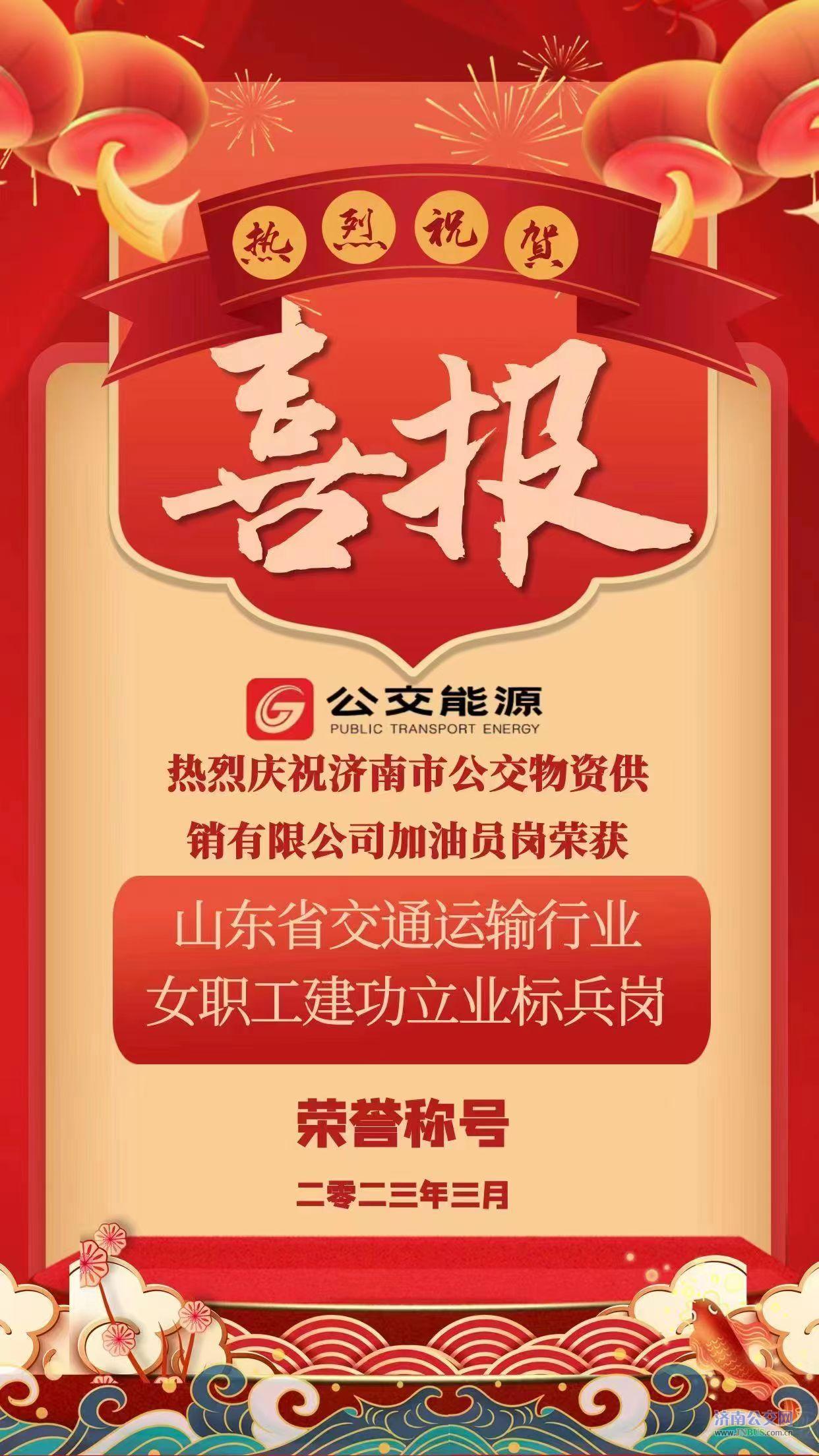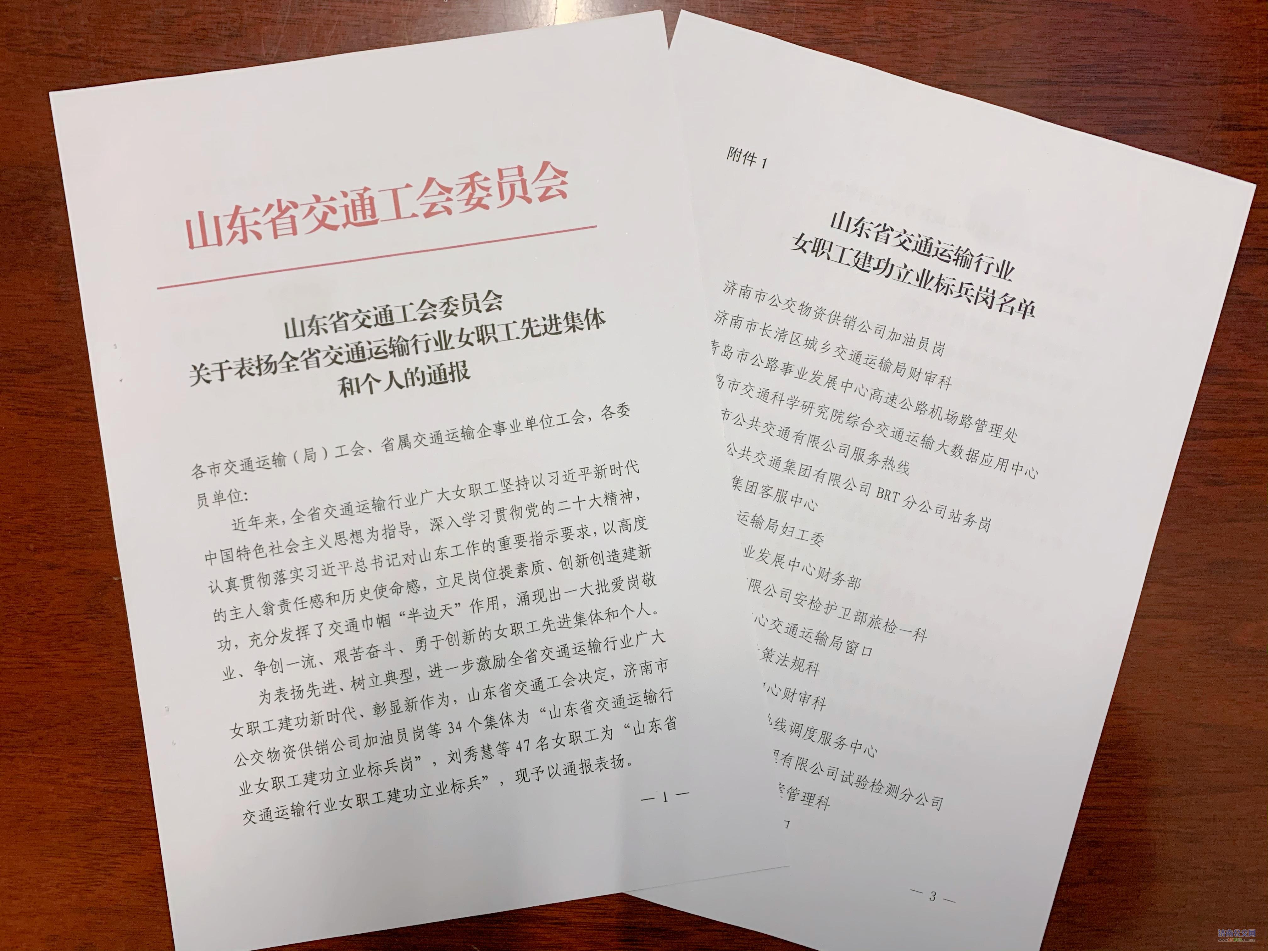 2023年“三八”国际劳动妇女节期间,山东省交通工会委员会发布了《关于表扬全省交通运输行业女职工先进集体和个人的通报》,济南市公交物资供销公司加油员岗被授予“山东省交通运输行业女职工建功立业标兵岗”荣誉称号。