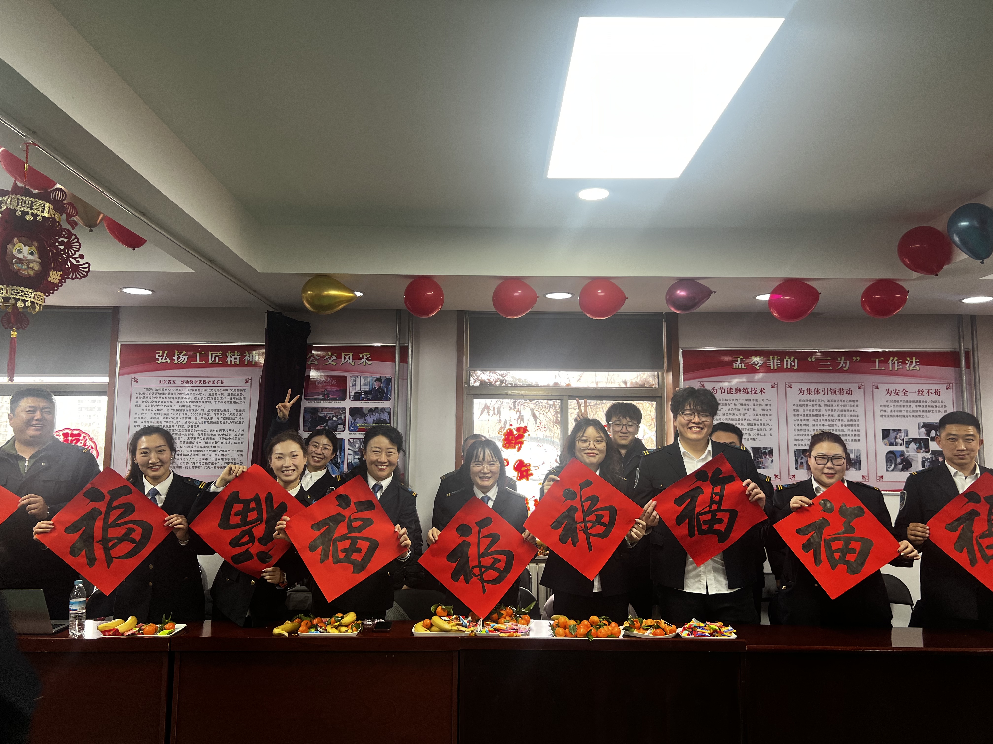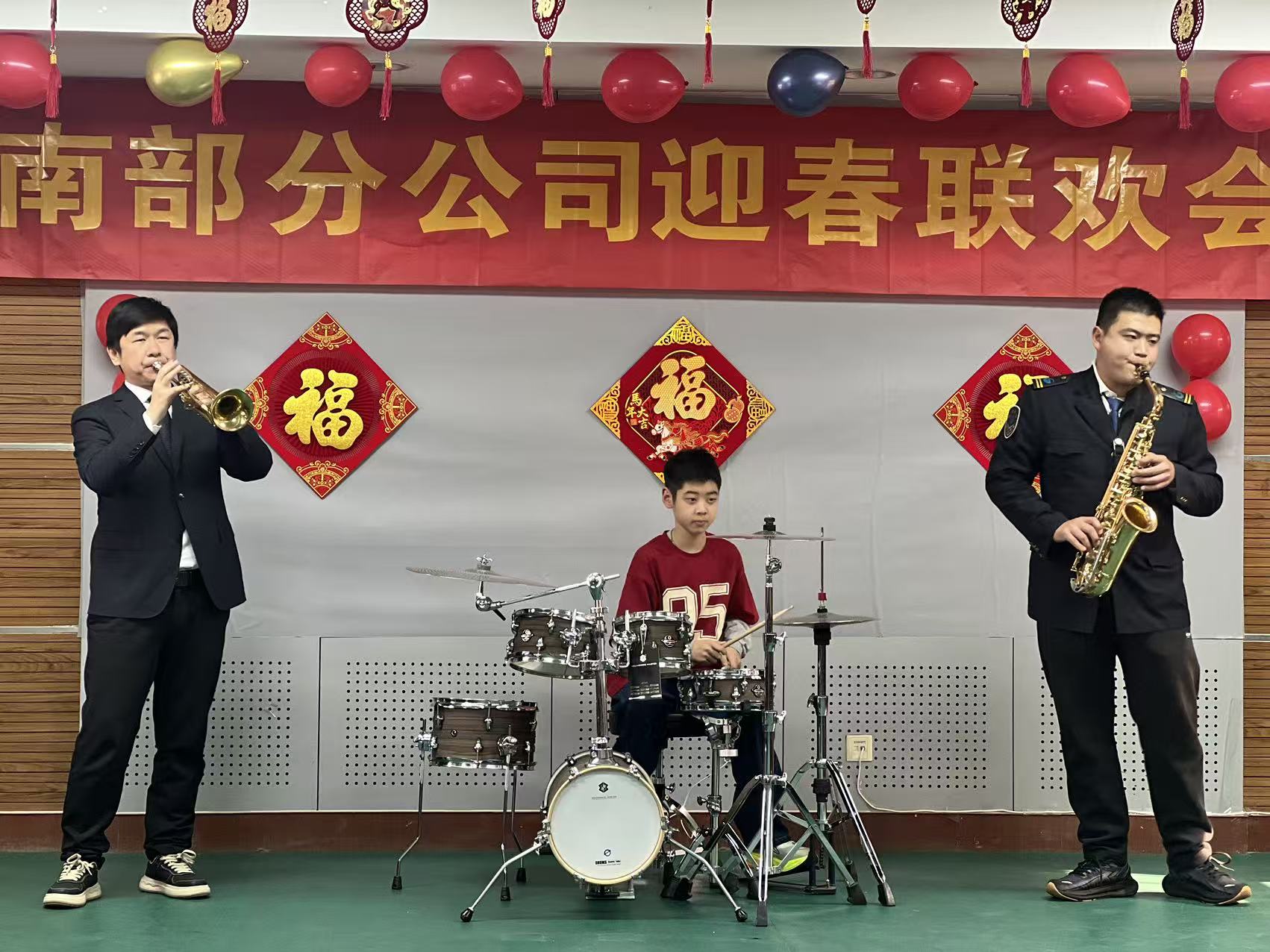 最受期待的乐器串烧表演中,10岁小嘉宾杨珺宇携手公司职工同台演绎,架子鼓与小号、萨克斯默契配合,尽显热爱与传承的力量。原创歌曲《泉城平安线》更是唱出了公交人的使命担当与坚守初心,引发全场职工共鸣,将联欢会氛围推向高潮。《荷塘月色》的优美歌声过后,书法表演《惠来送福》为联欢会画上圆满句号,笔墨间的福字传递着新春美好祈愿。