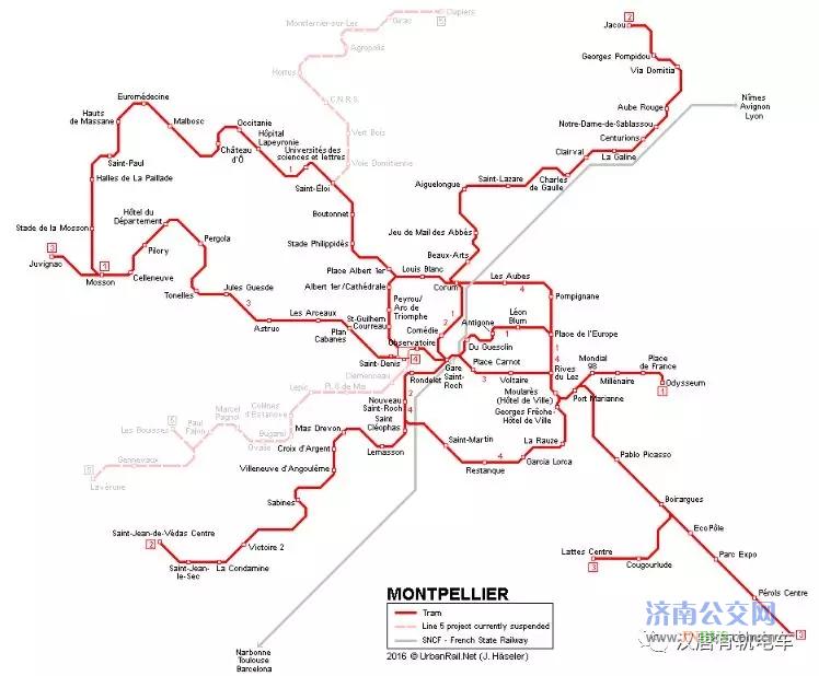 5号线工程已经开工,不过目前只开工了一小段,用以补充4号线, 使轨道网在市中心外围形成一个完整的环线,但5号线从Clapiers到Lavérune的其余外围路段,暂被搁置。