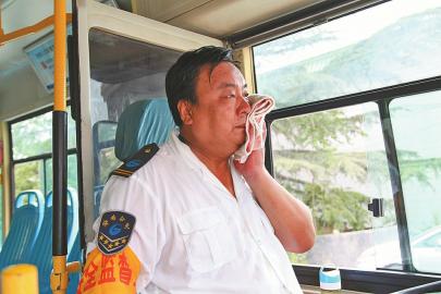 车厢内闷热难当,13路驾驶员顾克强只能用湿毛巾降温。(本报见习记者 李任重 摄)