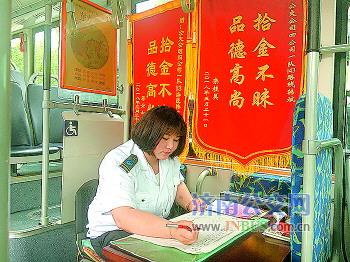 7日上午11点多,记者来到车队驻地。这里的公交场站与其他地方有所不同,驾驶员日常休息生活的站房并不是一间房子,而是一辆公交车。从外面看,这辆公交车与其他的公交车没有什么不同,但走进车厢内部才发现,这俨然就是一个“移动办公室”。里面陈列着一张办公桌和一把椅子,工作人员正在办公,有驾驶员正在公交座椅上吃午饭。两面锦旗挂在工作人员身旁的车窗上,“拾金不昧”的字样在阳光的照射下显得格外耀眼。显然,这里驾驶员们的工作深得乘客认可。