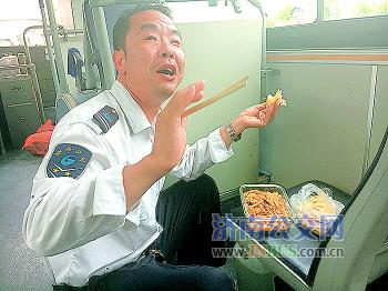 由于站点地处偏远、条件有限,公交驾驶员吃饭、喝水、如厕都是不小的问题。每到中午,车队工作人员提前统计好人数,开车往返近10公里去帮大家买饭。由于营运时间不同,不少人回到车场时,饭菜都已经凉了。由于车厢空间有限,每到吃饭集中时间,有人甚至站着吃完午饭。“我们车上有冰箱,有些驾驶员会自己带饭,中午用微波炉热一下。”驾驶员王鹏说,他们基本早上5点就得从家出门,很多时候早饭和午饭一起吃。