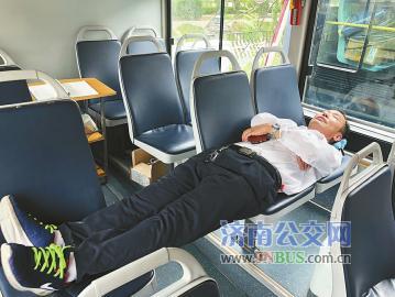 “离家远的早上4点半就出门,到上午11点左右回来吃饭,天热比较辛苦,中午想眯一会儿,于是,驾驶员们练就了一身‘睡椅功’。”王军说着给记者展示起来。头和上身在双人坐椅上,腿悬空在过道上,脚放在过道另一侧的坐椅上,坐椅比较窄,整个人只能笔直地躺着,一翻身就会掉下来。“这样躺着也睡不着,但可以休息休息,为下午出车养足精神。”王军表示。