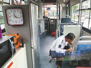 从外面看这辆“移动站房”与其他公交车没有什么不同,但走进车厢内部才发现,这俨然就是一个“移动办公室”。里面陈列着一张办公桌和一把椅子,还有冰箱、微波炉、饮水机。7日上午11点20分,在“移动站房”里,K143路公交驾驶员王军正坐在小马扎上吃午饭,而饭桌就是公交车上的坐椅。