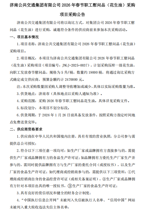 职工慰问品(花生油)采购项目采购公告